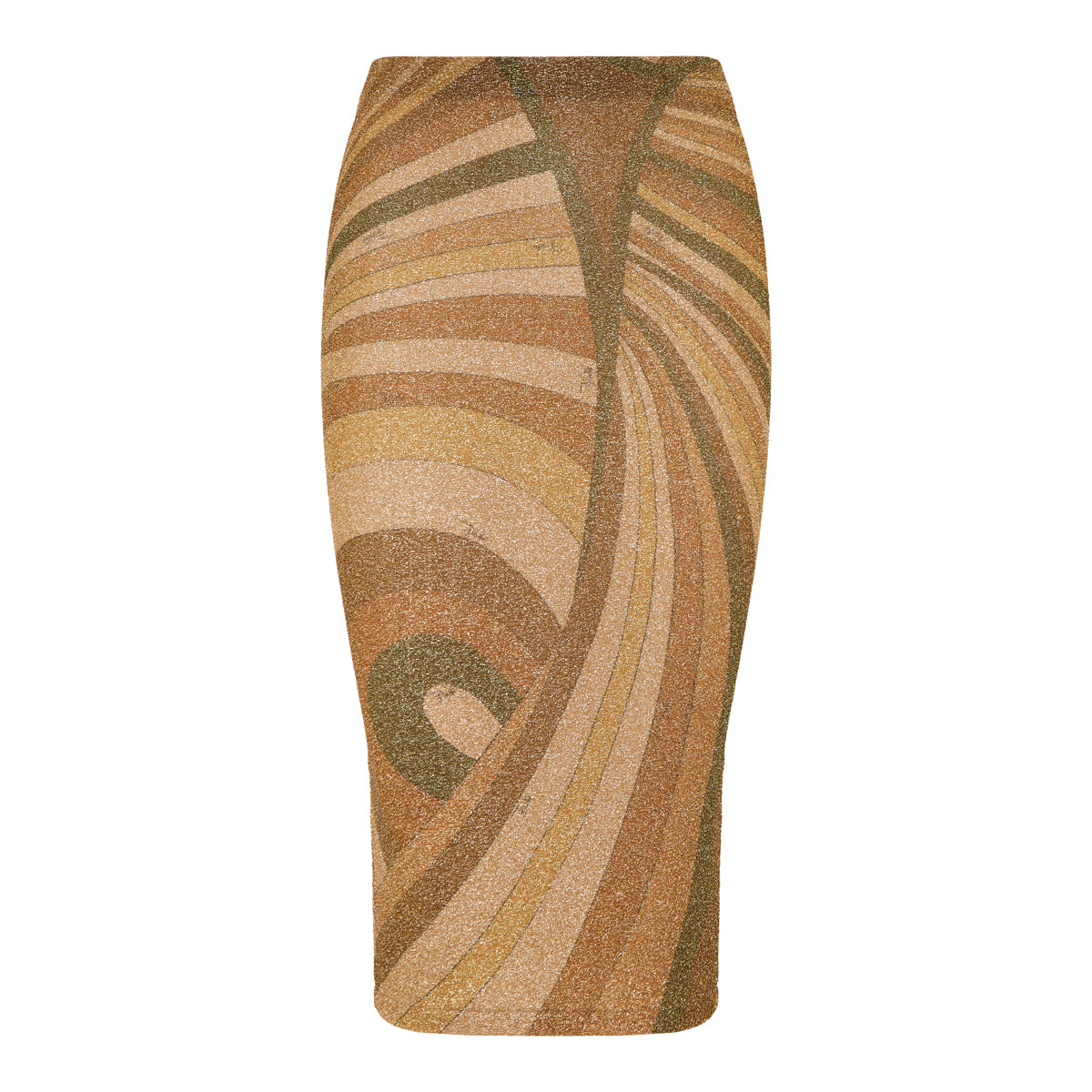 Pucci’s Iride-print midi skirt shimmers with a fluid silhouette that perfectly balances glamour and ease. Cut from lamé jersey, the design is enlivened by the house’s signature swirling motif in multicolor tones. Its lightweight, stretchy fabrication ensures comfort while the luminous finish makes it ideal for evening occasions and standout resort styling.