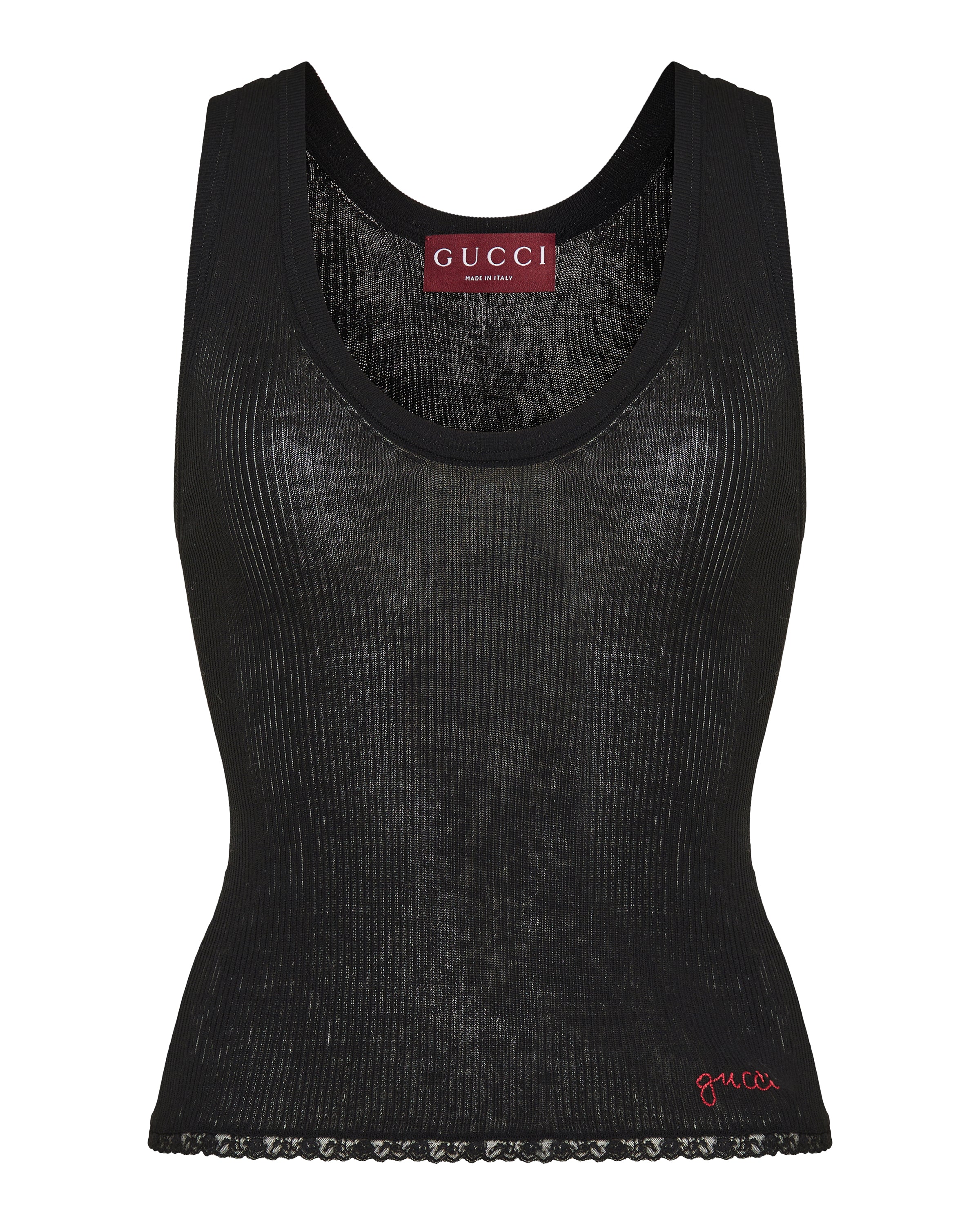 Refined in its simplicity, this ribbed tank top reflects Gucci’s contemporary approach to elevated essentials. Crafted from cotton, it features a clean, fitted silhouette accented with subtle embroidery that adds a discreet signature touch. Balanced and versatile, it is suitable for everyday wear, refined casual styling, and polished layering, offering understated elegance with a modern attitude.