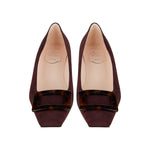 The Roger Vivier Belle Vivier 45 Suede Pumps in Burgundy are a refined blend of classic design and modern elegance. Crafted from soft suede, these pumps feature a square toe and a 45mm block heel, providing both comfort and style. The signature Vivier buckle detail adds a touch of sophistication, making them perfect for both day and evening wear.