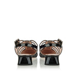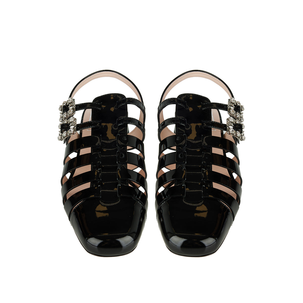 The Roger Vivier Mini Très Vivier Crystal-Embellished Patent Leather Sandals are a refined blend of classic design and modern elegance. Crafted from glossy patent leather, these sandals feature the iconic crystal-embellished buckle and a comfortable 25mm block heel. The open-toe design and slingback strap add a touch of sophistication, making them perfect for both day and evening wear.