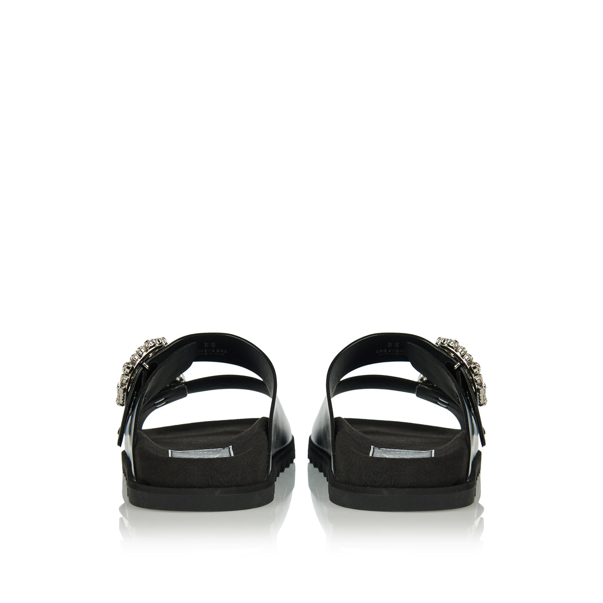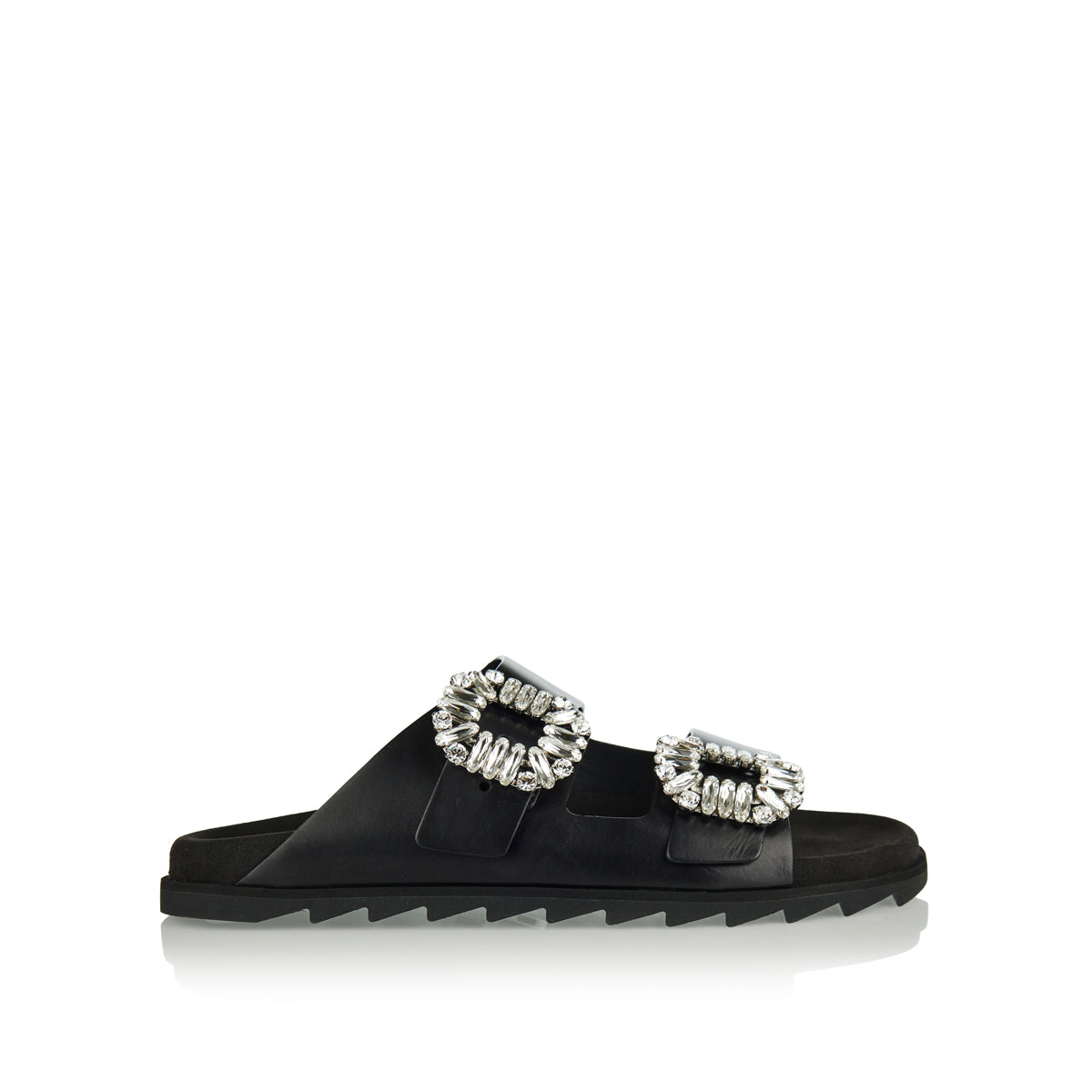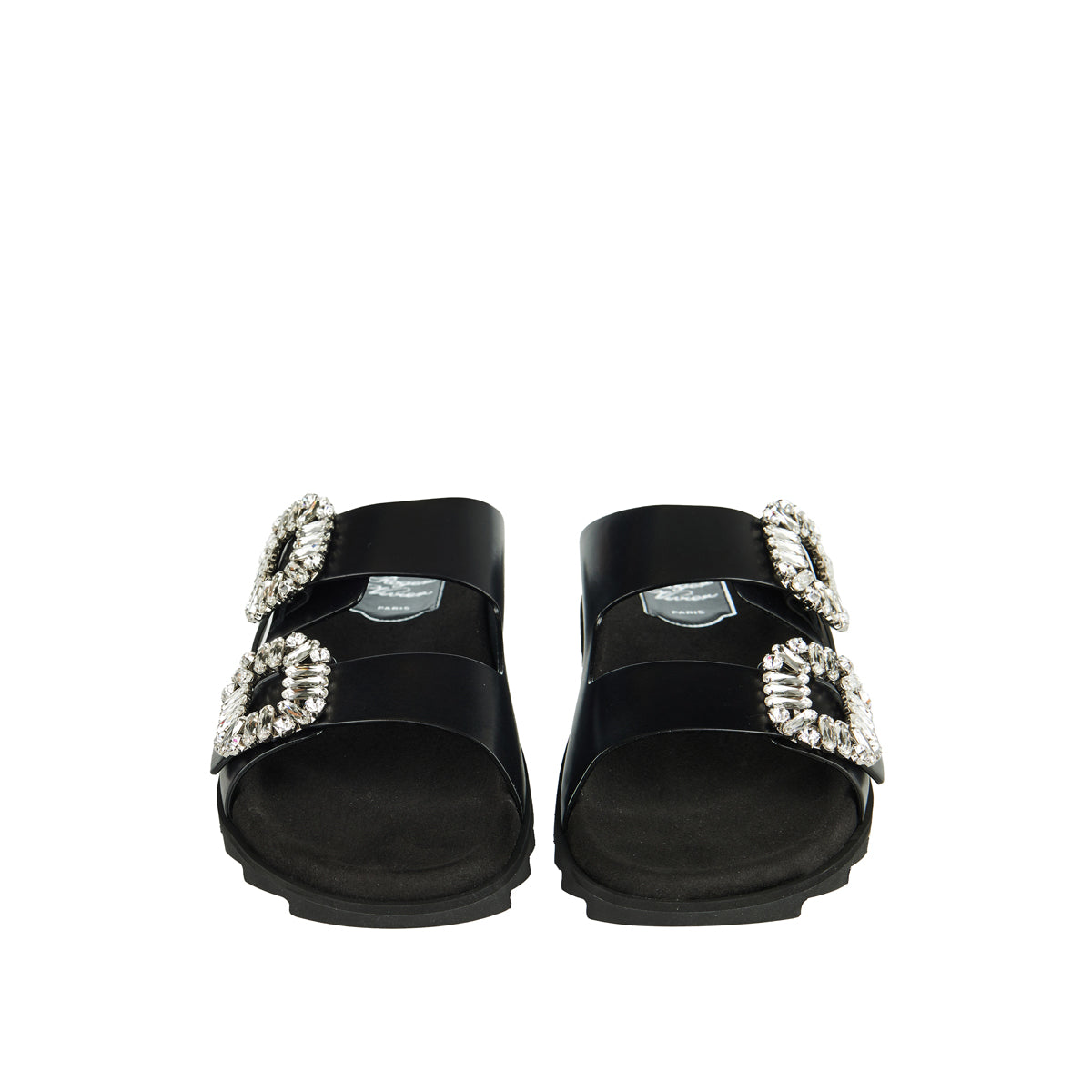 The Roger Vivier Viv' crystal-embellished buckle sandals are a luxurious fusion of comfort and glamour. Crafted from soft leather, these sandals feature oversized crystal-embellished buckles and a moulded footbed for all-day comfort. The ridged, jagged sole adds a touch of modern edge, making them perfect for both casual and dressy occasions.