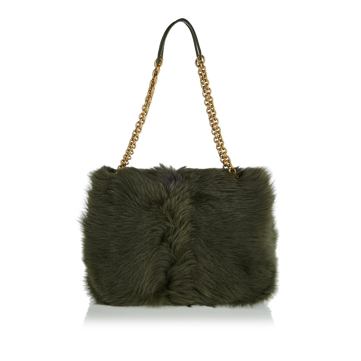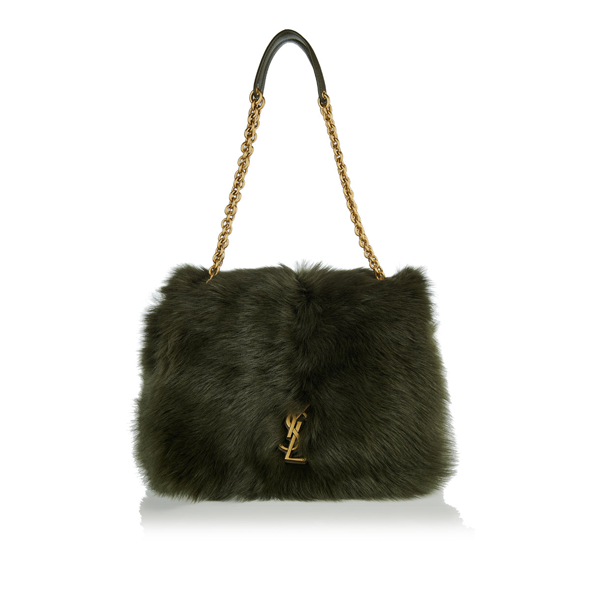 The Saint Laurent Jamie 4.3 medium shearling bag in dark olive is a luxurious statement piece featuring the iconic Cassandre logo in gold-tone metal. Crafted from plush shearling, it offers a lightweight and spacious design with an adjustable sliding strap for versatile styling options. Perfect for adding a touch of elegance to both day and evening looks.