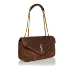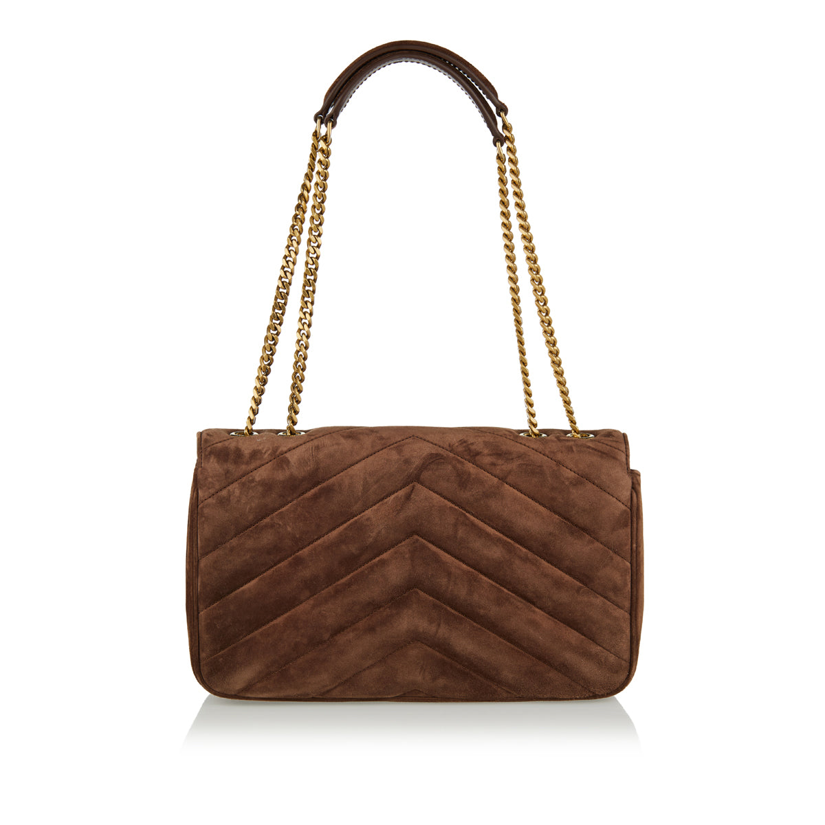 A sophisticated medium-sized bag crafted from luxurious matelassé suede, featuring the iconic YSL logo plaque. Its chevron-quilted design and sliding chain strap offer versatility, allowing it to be worn on the shoulder or crossbody. Ideal for both day and evening occasions.