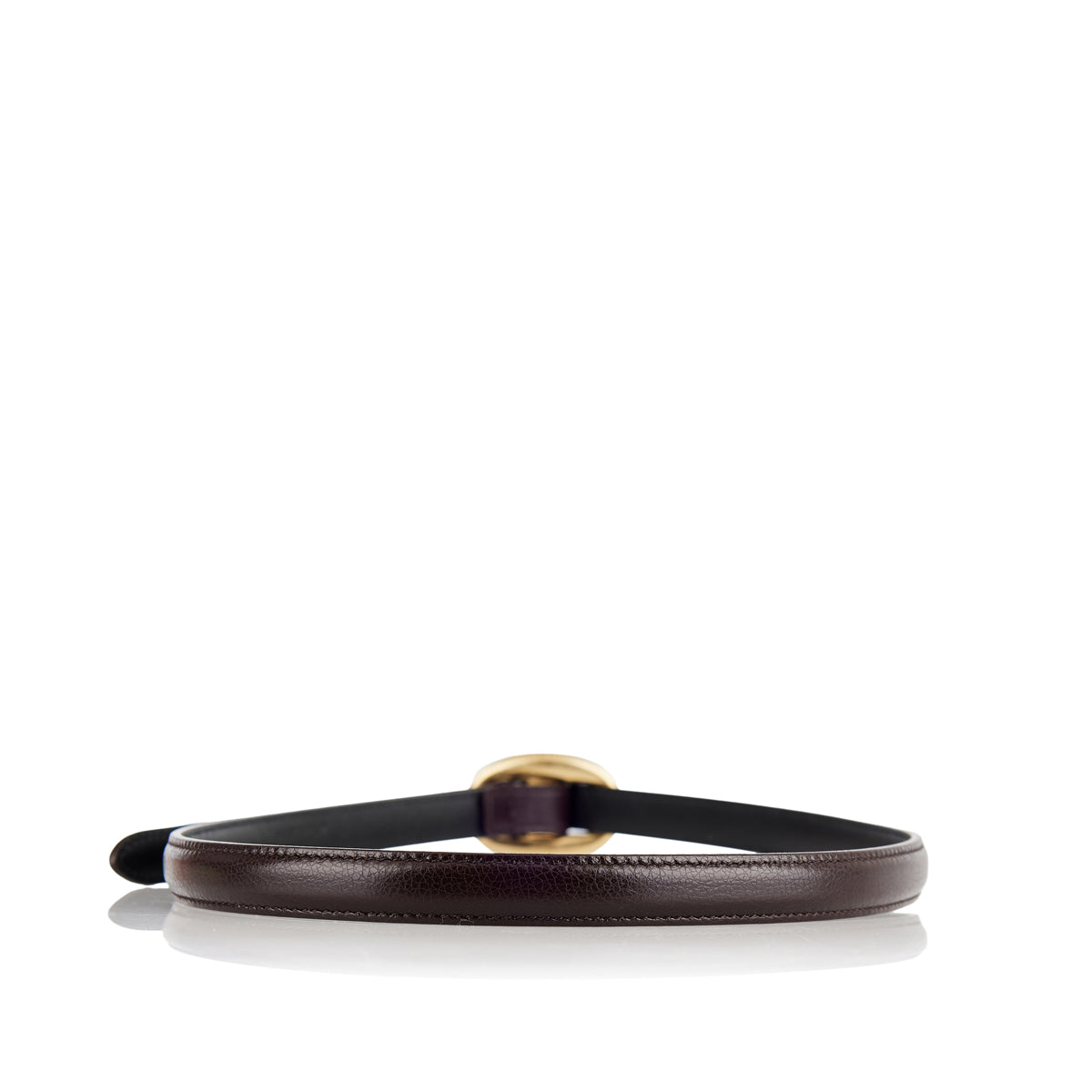 This sleek belt from Saint Laurent is crafted from high-quality glossed calf leather, featuring a polished metal buckle. Its minimalist design makes it a versatile accessory for both casual and formal occasions.