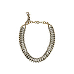 A bold triangular chain necklace by Saint Laurent, adorned with round and emerald-cut crystals set in aged-bronze tone metal. The adjustable clasp includes a Cassandre charm and engraved Saint Laurent detailing.