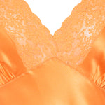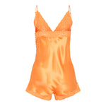 This Saint Laurent jumpsuit is cut from lustrous orange silk satin and detailed with lace inserts, a plunging neckline, and delicate covered buttons at the back.