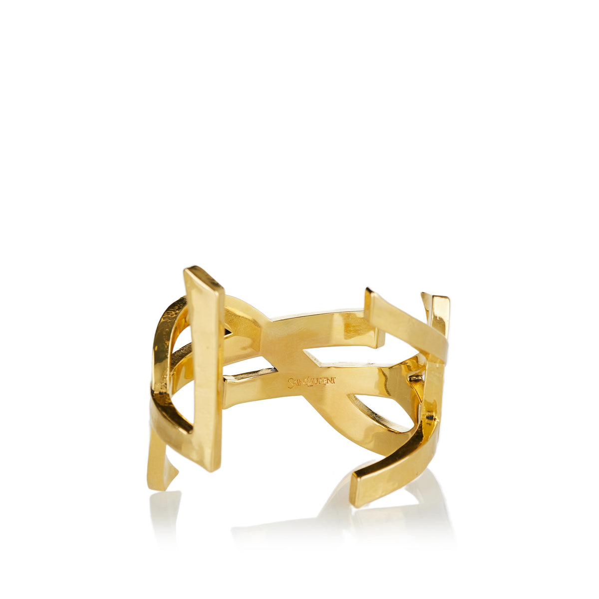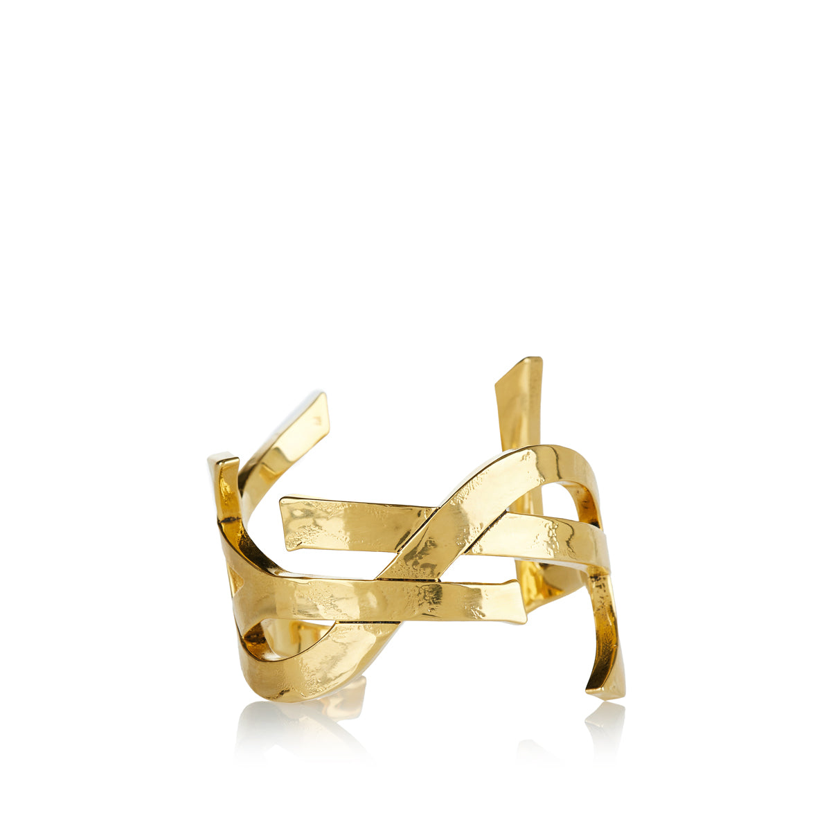 A bold open cuff bracelet crafted from hammered brass, featuring the iconic Cassandre logo at the center. Designed with a twisted silhouette, this piece embodies the brand's signature elegance and modernity.