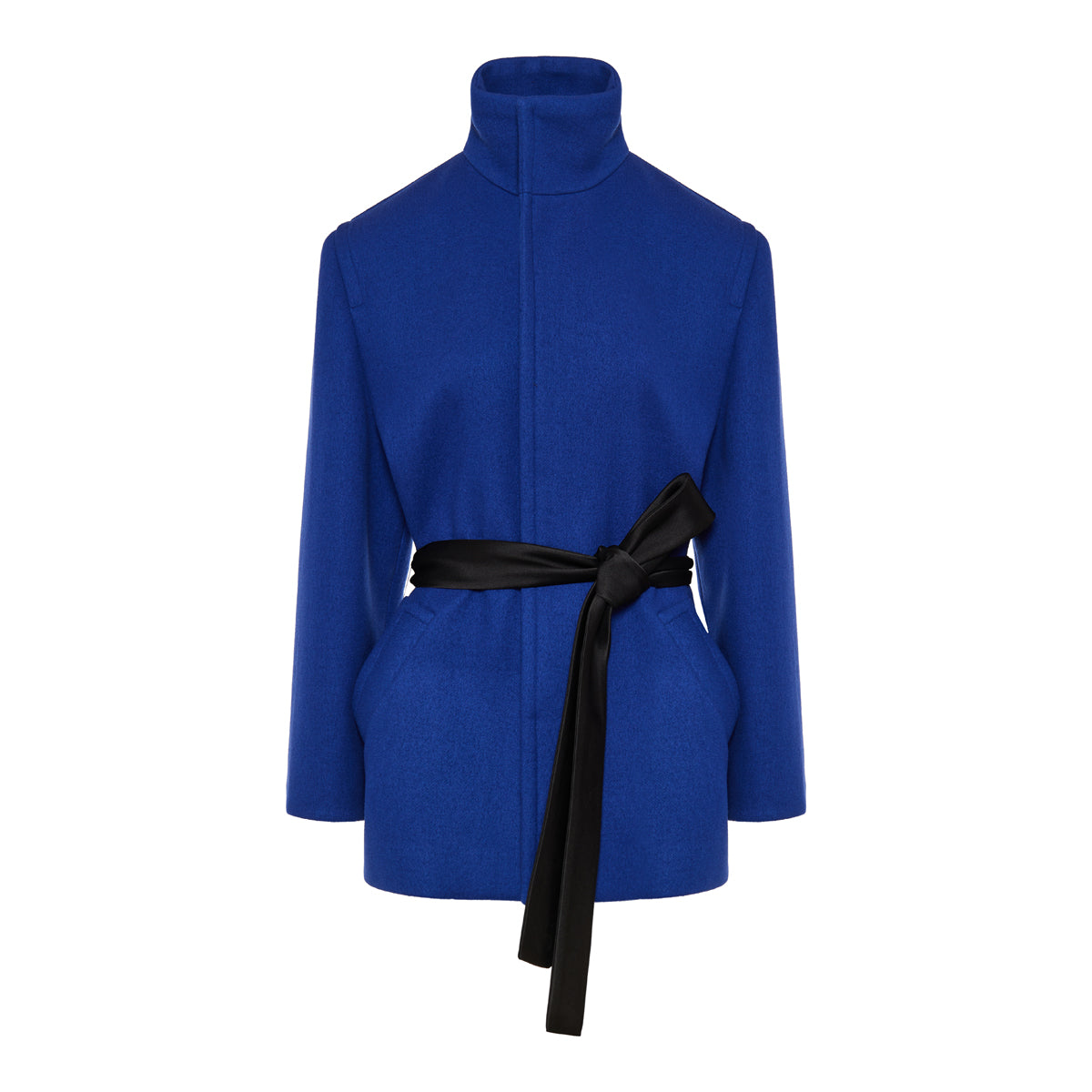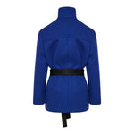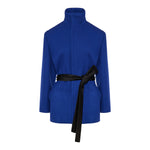 A sculptural, power‑dressing coat from Saint Laurent crafted in bright‑blue wool‑felt with padded shoulders and a black silk‑satin belt. This oversized silhouette combines structured elegance with modern tailoring.