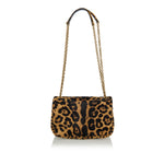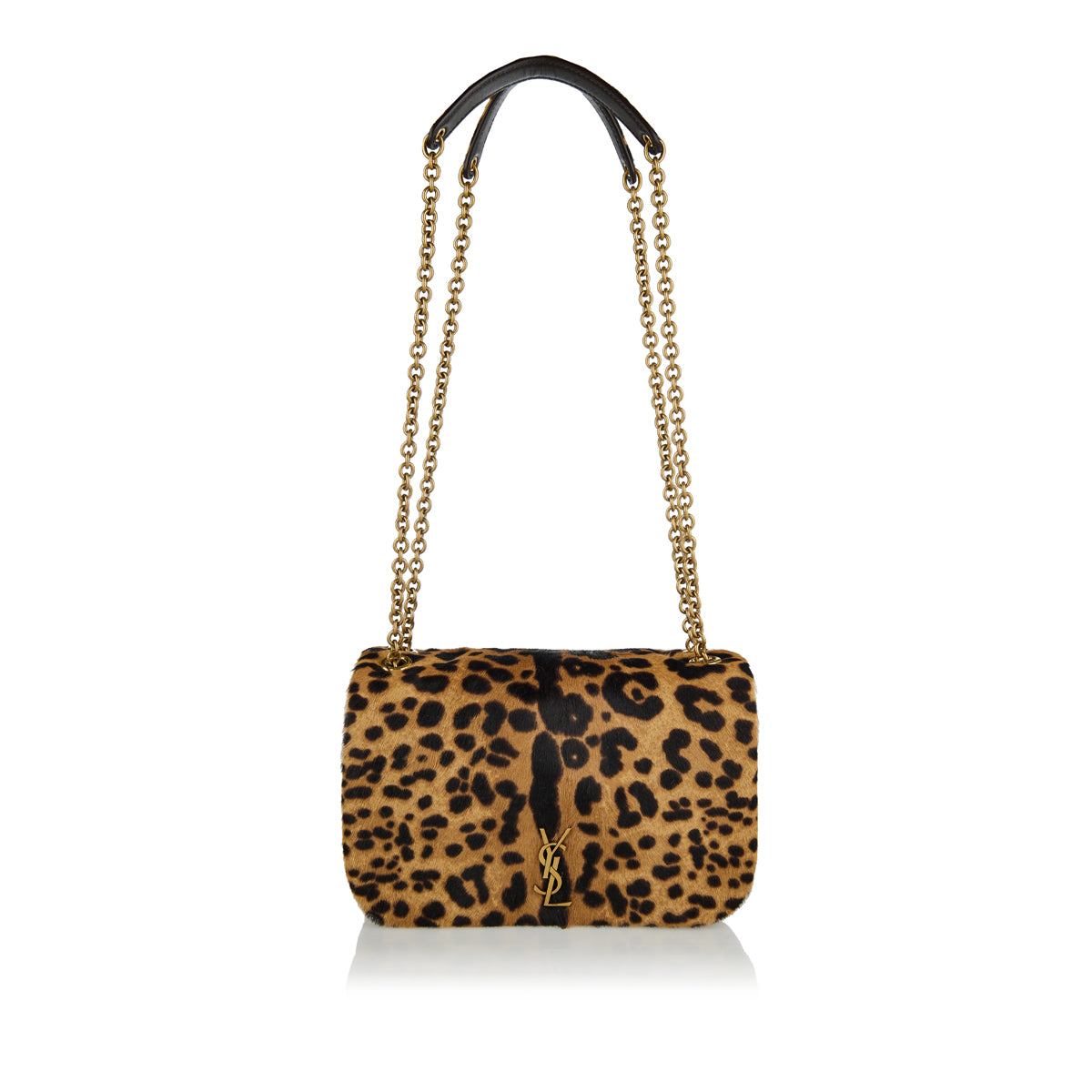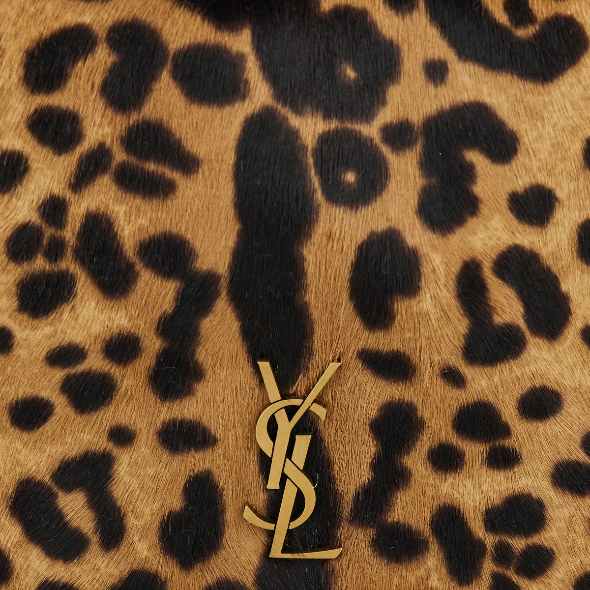 This compact Jamie 4.3 mini from Saint Laurent is crafted in leopard-print pony hair with smooth leather trim, featuring a sliding leather-and-chain strap for shoulder or crossbody wear, a magnetic snap closure, and a leather interior lining. Elegant and versatile, it suits both day and evening looks with refined edge.