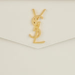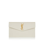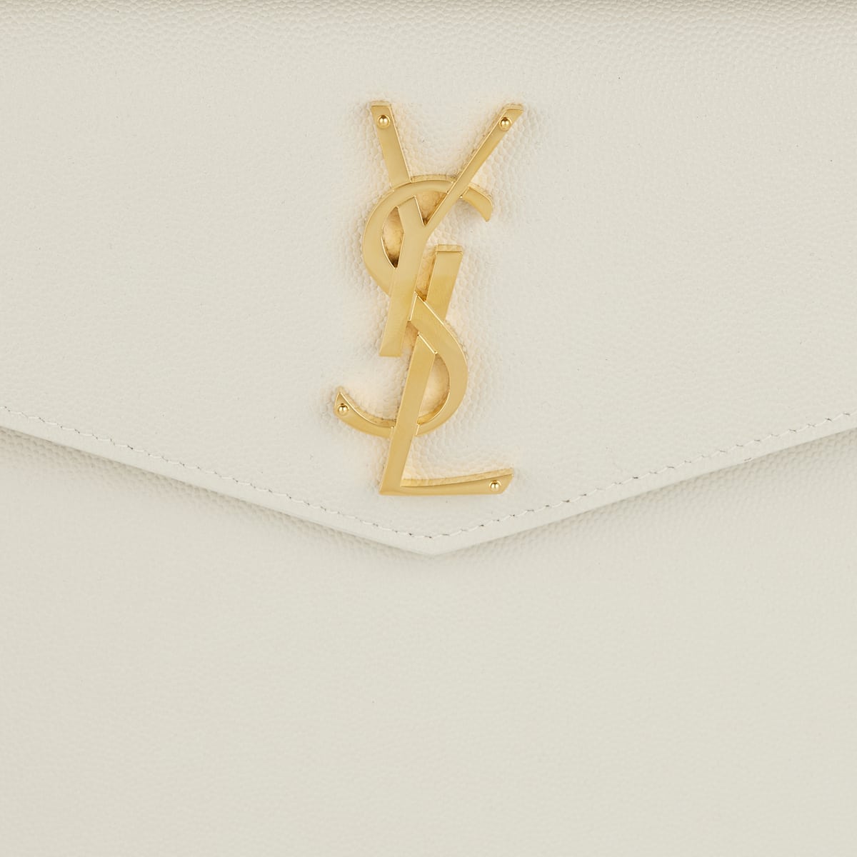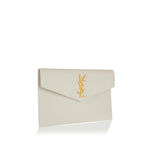 The Uptown clutch in grainy leather has a flat silhouette defined by the Cassandre embellishment. Pointed flap top, magnet closure and one compartment are its main features.