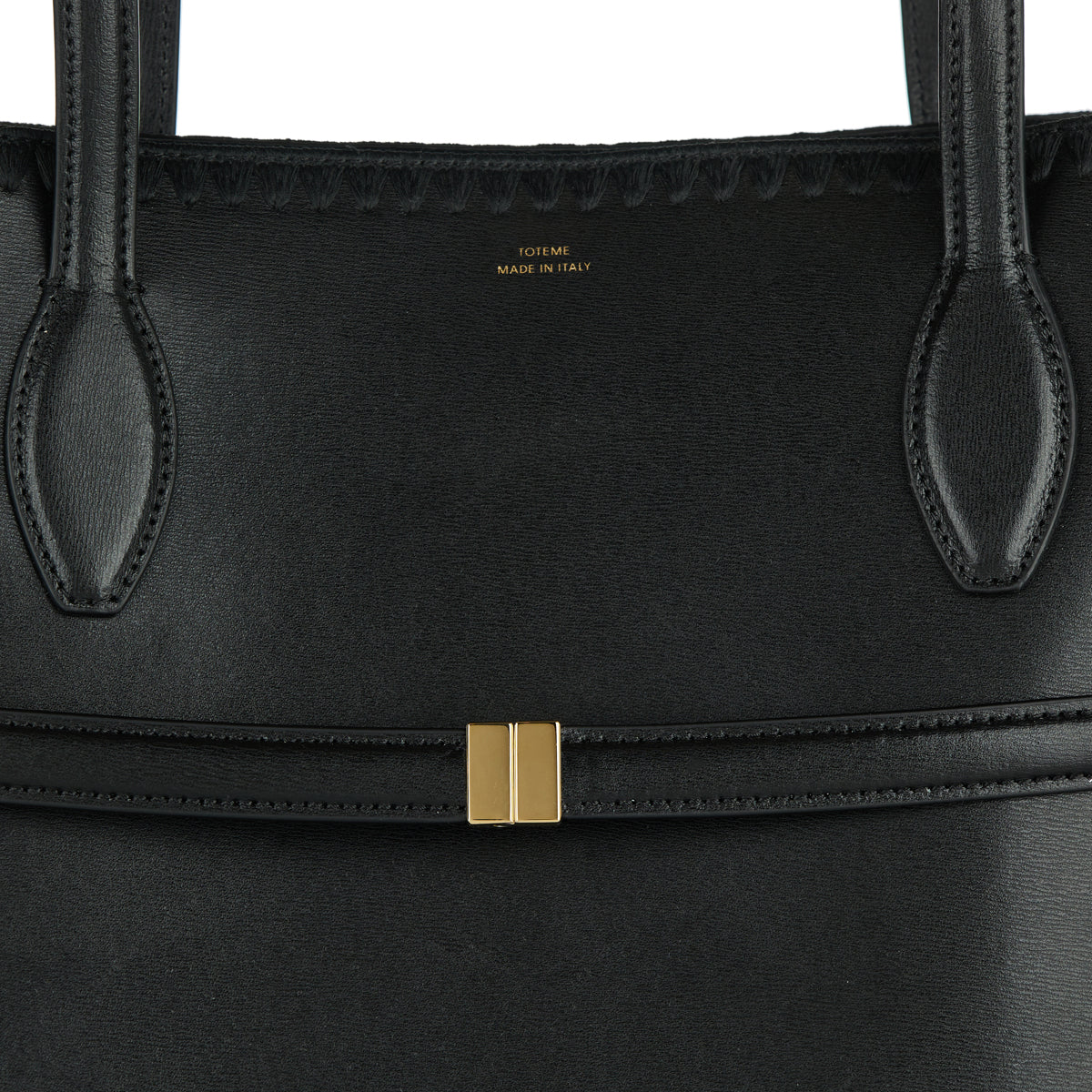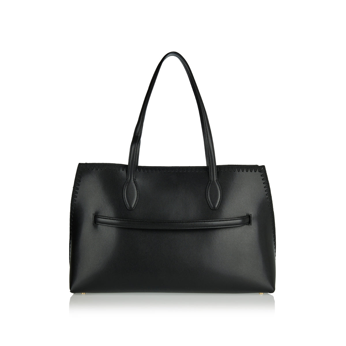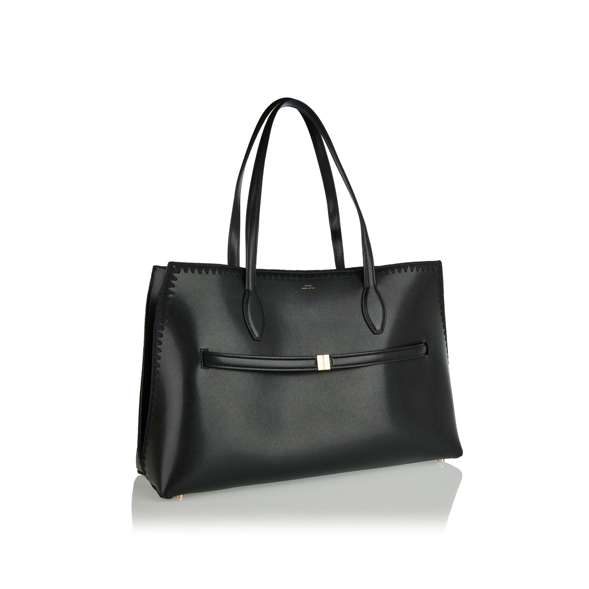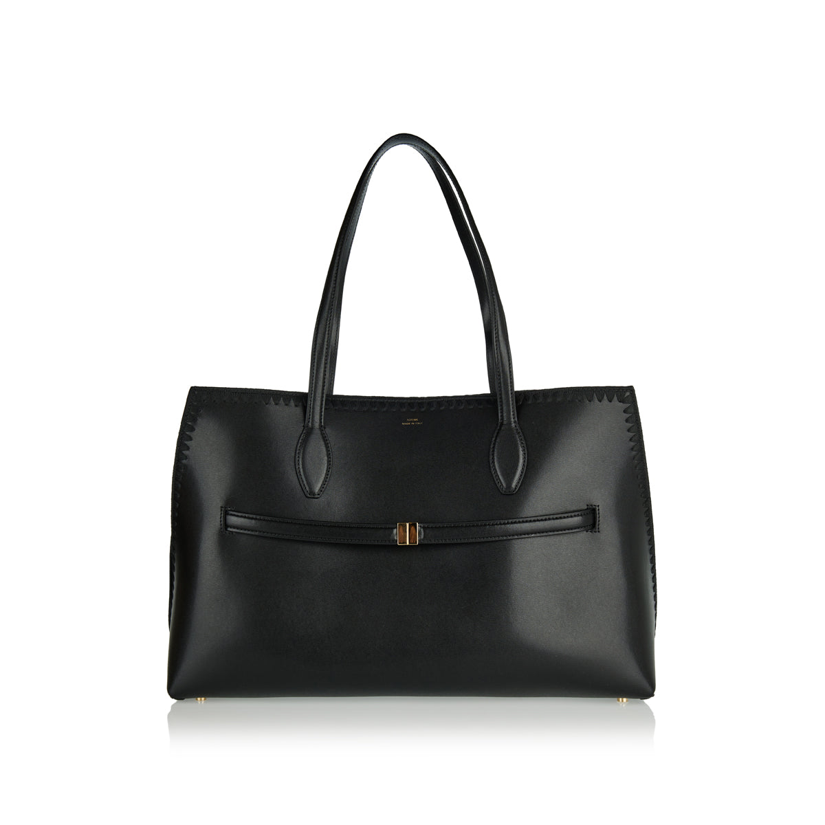 A luxurious leather tote adorned with tonal blanket-stitch embroidery and featuring a slim belt clasp closure, top handles, and a microsuede interior. Perfect for chic daily use or refined going-out moments, this piece merges quiet elegance with functional design.