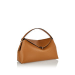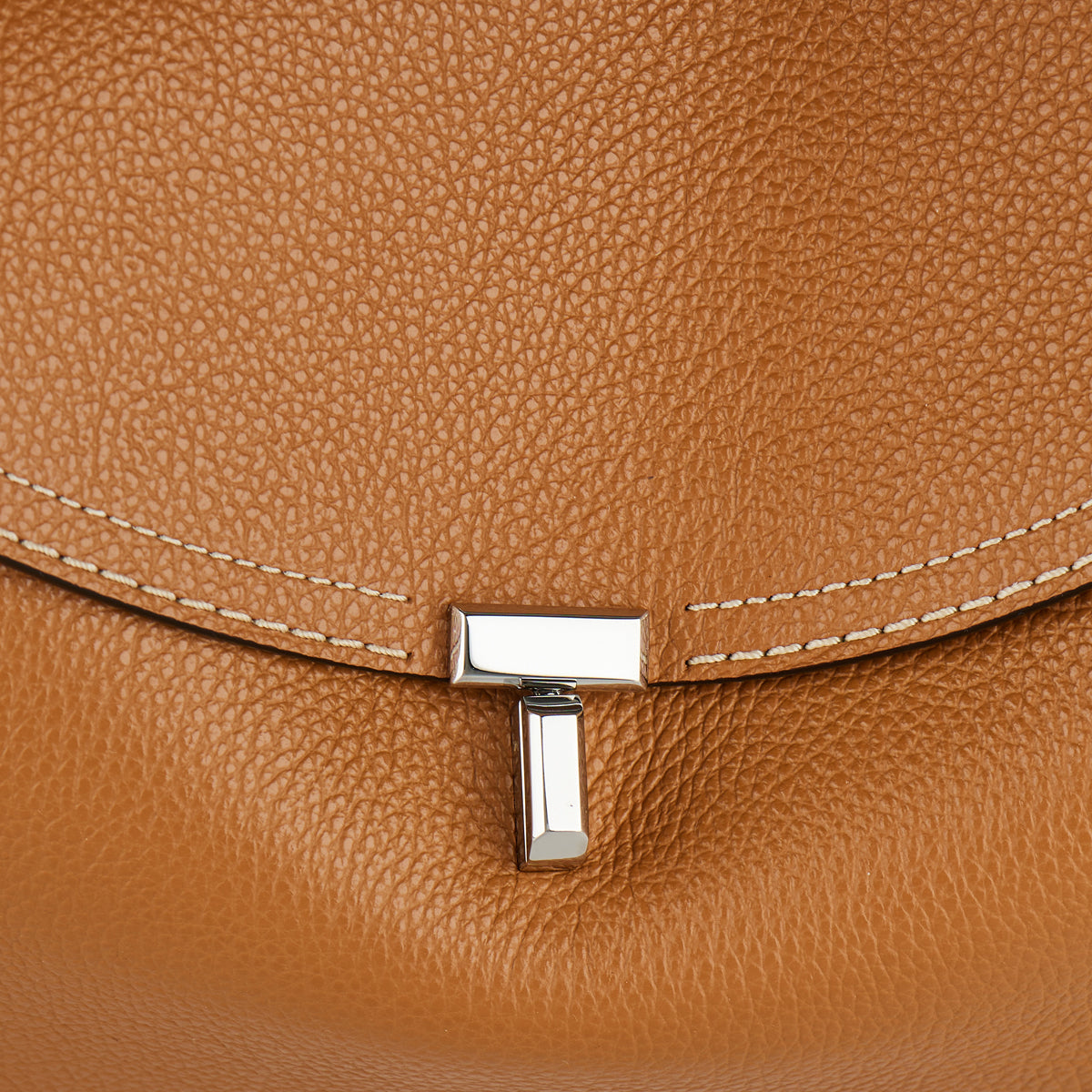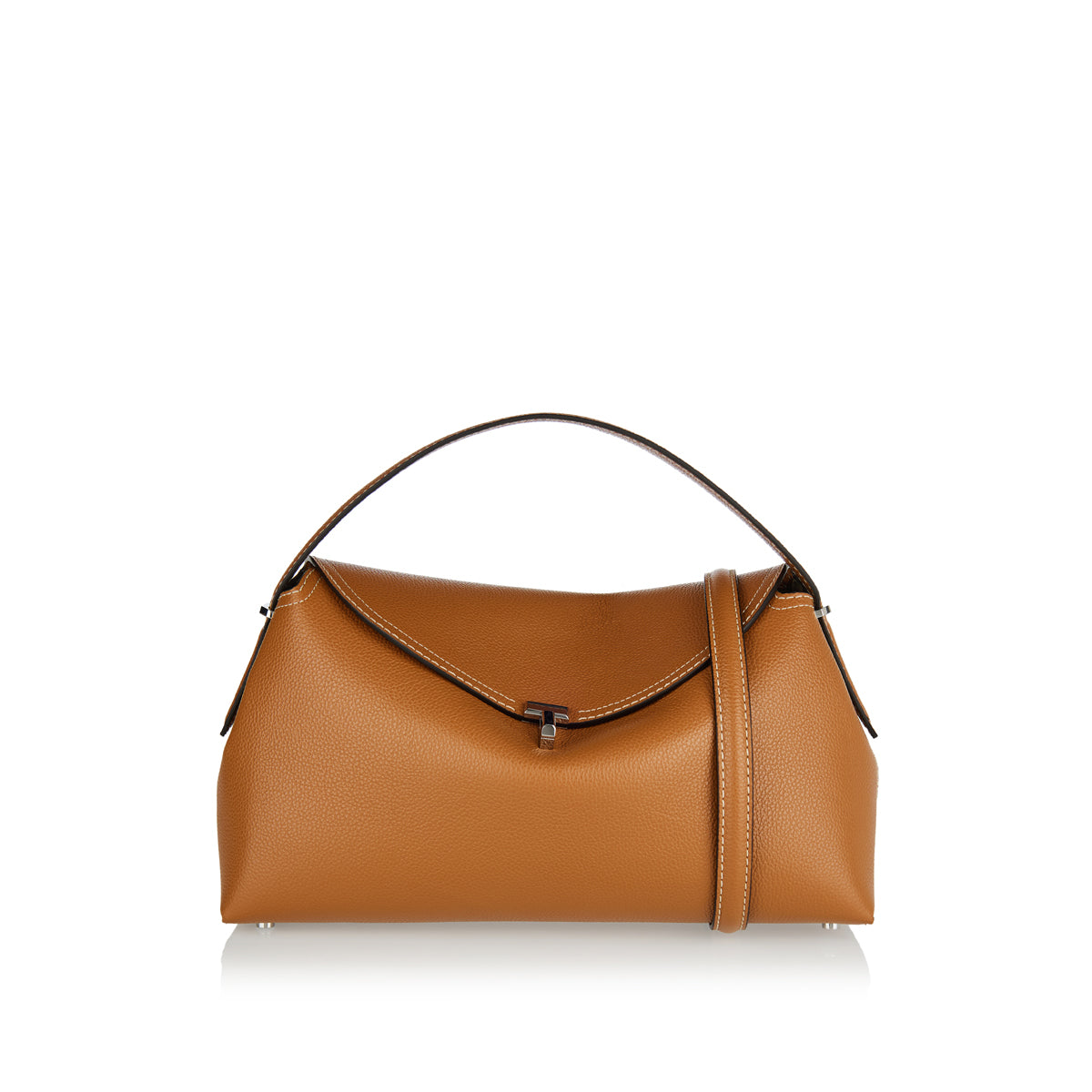 A sculptural top-handle bag from Toteme, featuring a curved topline that complements the shape of the hand and arm. Crafted from supple yet resilient pebble-grained leather, it is finished with a silver-tone twist lock and a beige microsuede lining. Ideal for formal occasions and evening events, this accessory offers a sophisticated touch to your ensemble.