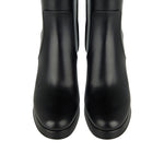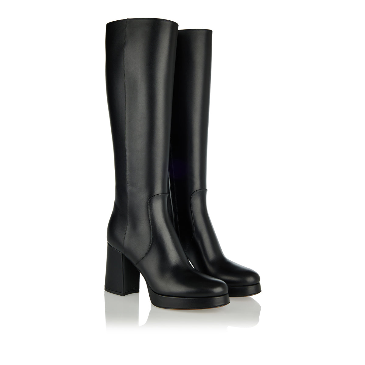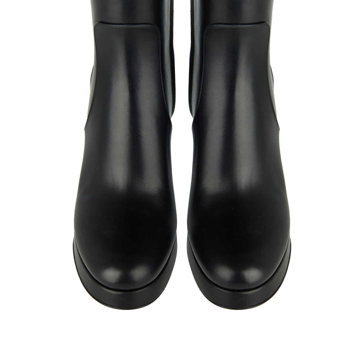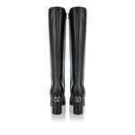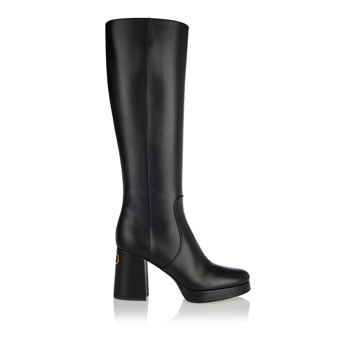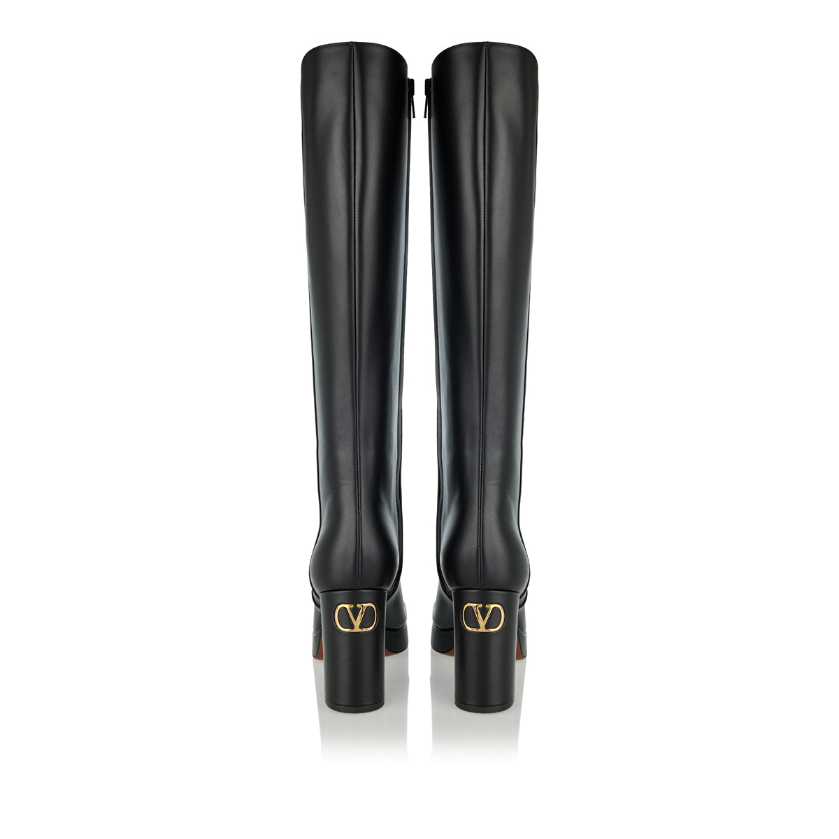 The Valentino Garavani Fawcette VLogo leather platform boots are crafted from premium leather, featuring a 9 cm block heel and a 2 cm platform for added comfort. The boots are adorned with the VLogo Signature detail in antique brass-effect finish, adding a touch of sophistication. Made in Italy, these boots combine style and functionality seamlessly.