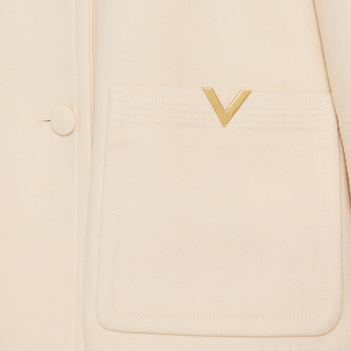 A tailored peacoat crafted from 100% virgin wool, featuring a relaxed fit, front button closure, and V Gold detail on the pockets. The coat is lined with a luxurious blend of acetate and silk, showcasing the Flower, Stripes, and VLogo motifs. Ideal for formal occasions, it combines classic design with modern elegance.
