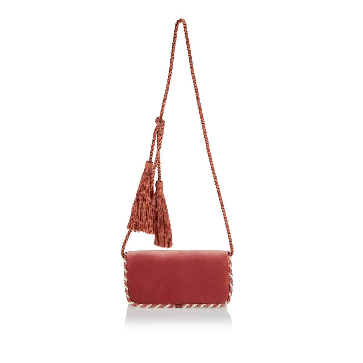 Velvet envelope-shoulder bag trimmed in tonal cord, featuring crystal-encrusted ‘VLogo’, tassel detail and detachable strap. Compact yet striking, designed for evening or elevated daywear, pairing glamour with craftsmanship and a magnetic closure to hold essentials like phone, cards, and lipstick.