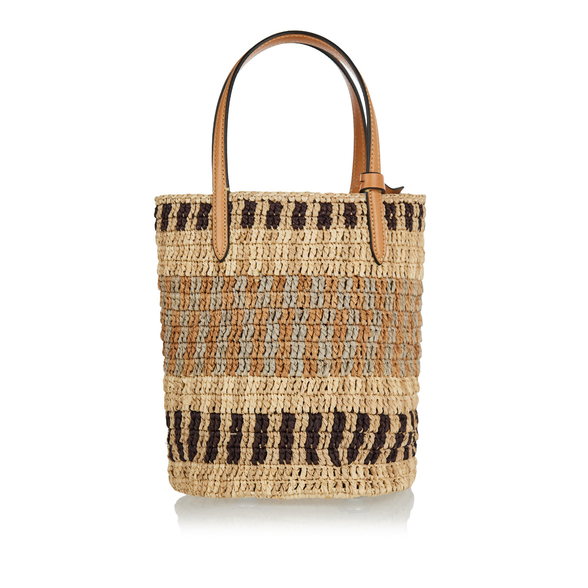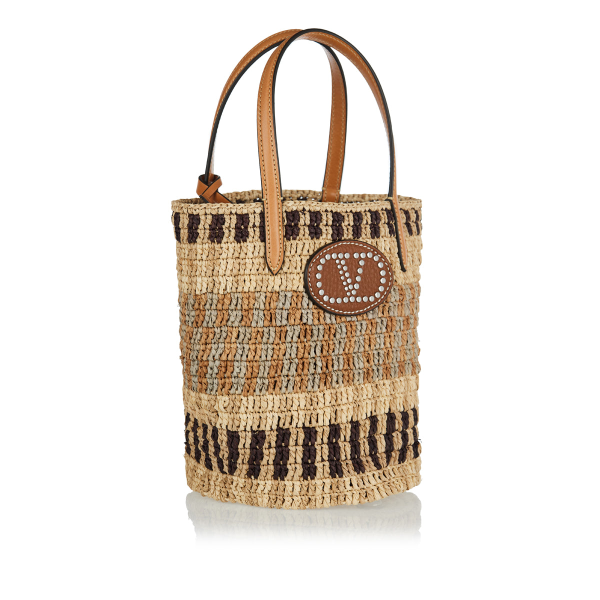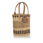 The Valentino Garavani VLogo Signature small bucket bag blends artisanal craftsmanship with modern sophistication. Woven from natural raffia and framed with smooth leather trims, the compact silhouette is adorned with the iconic gold-tone VLogo plaque. Its structured shape, drawstring fastening, and adjustable strap make it a versatile accessory for both daytime outings and evening escapes.