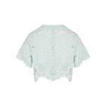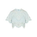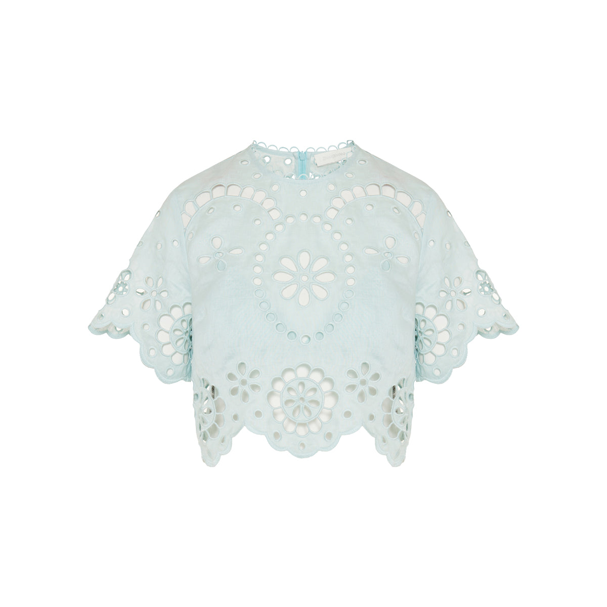 A graceful cropped top by Zimmermann in broderie anglaise-embroidered linen, with scalloped trim at the neckline and sleeves and a discrete zip at the back — perfect for refined summer styling or elevated casual wear.