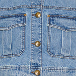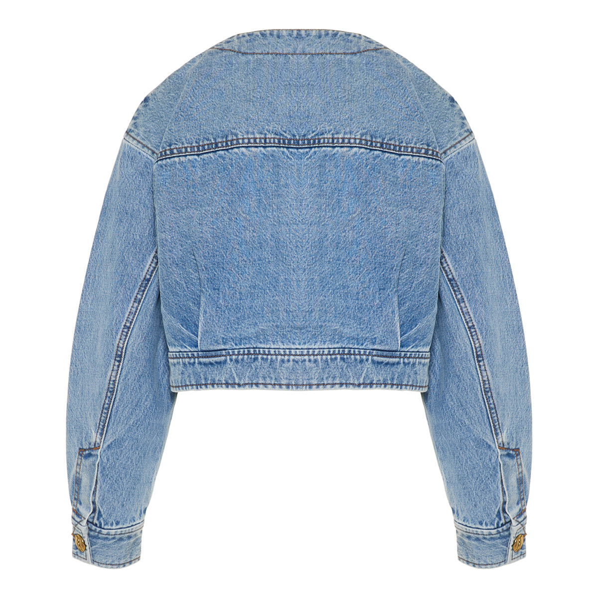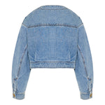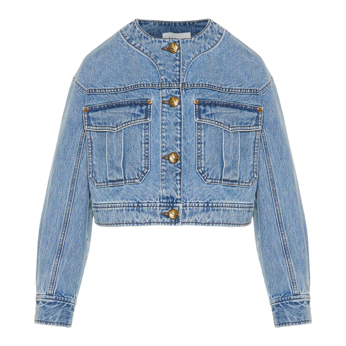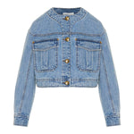 A refined take on casual outerwear, this cropped denim jacket features a scooped round neckline, gold-tone front buttons, and chest flap pockets. Crafted from 100% cotton, it offers a relaxed fit with subtle stitching details. Ideal for layering over dresses or pairing with high-waisted trousers for a chic daytime look.