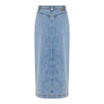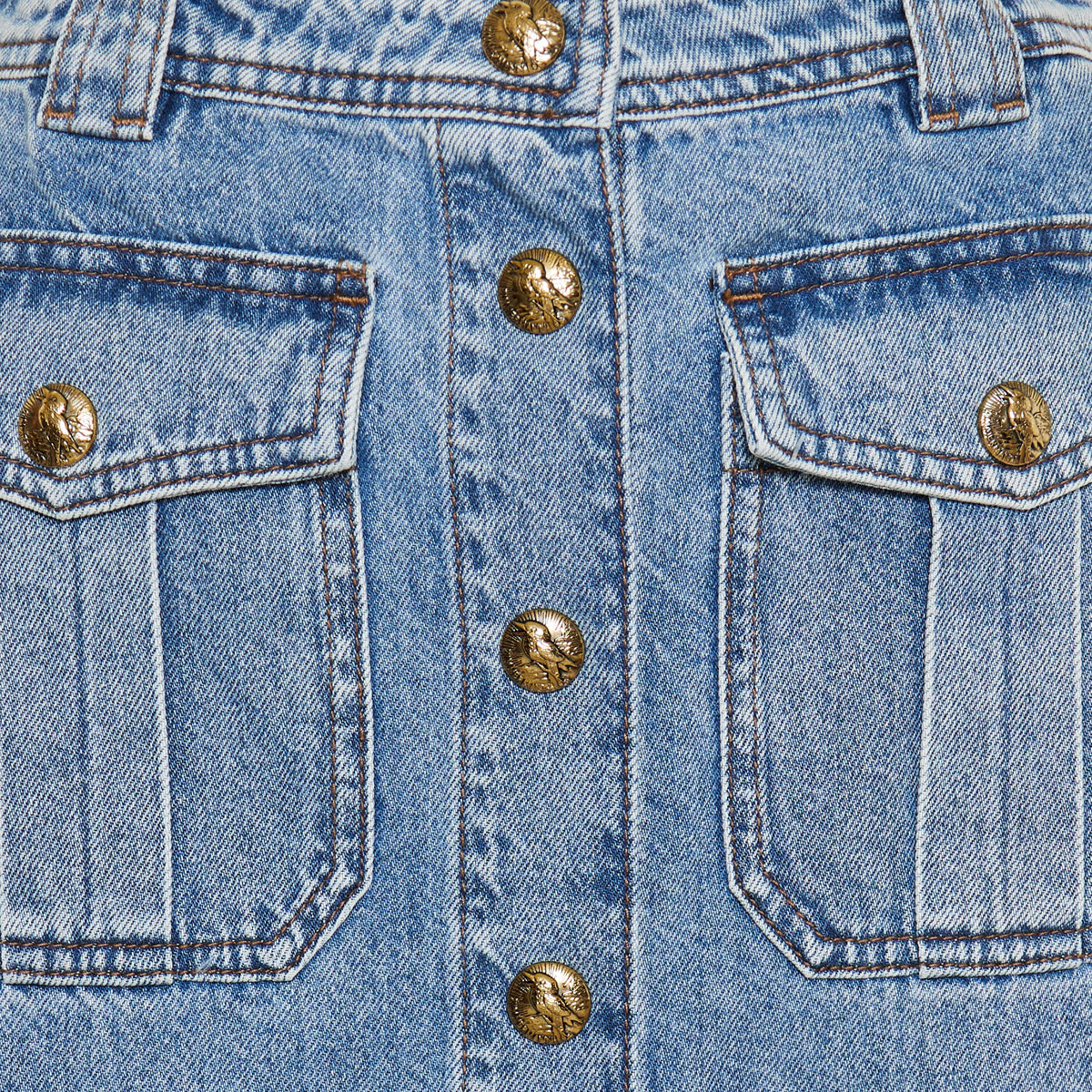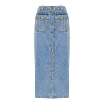 A refined take on classic denim, this high-waisted pencil skirt features front flap pockets, belt loops, and gold snap buttons down the center front. Designed for a fitted silhouette, it offers a polished yet casual look suitable for both daytime and evening wear.