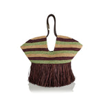 Hand‑woven in Madagascar from natural raffia, this Zimmermann tote features burgundy stripe detailing, a surf‑inspired tubular handle with gold‑tone mousqueton and fringe trim—tailored for elevated resort wear or city‑to‑beach transitions.