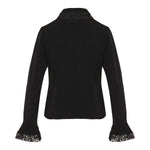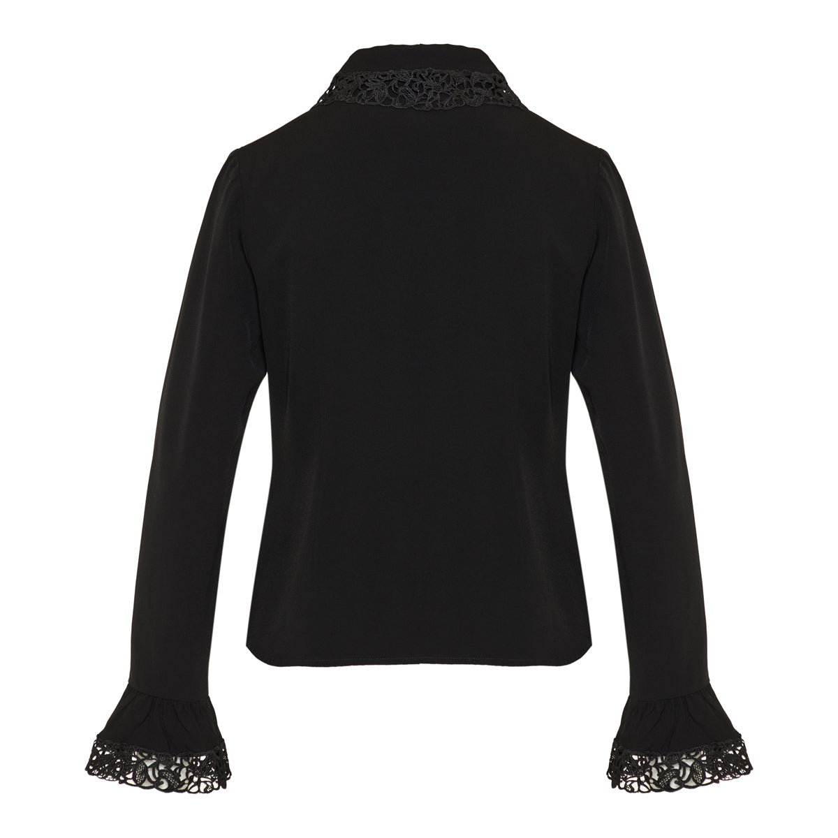 This fitted long-sleeve shirt features a classic collar, frilled cuffs, and lace trim throughout. Designed for a tailored silhouette, it offers a refined look suitable for both professional and formal occasions.