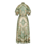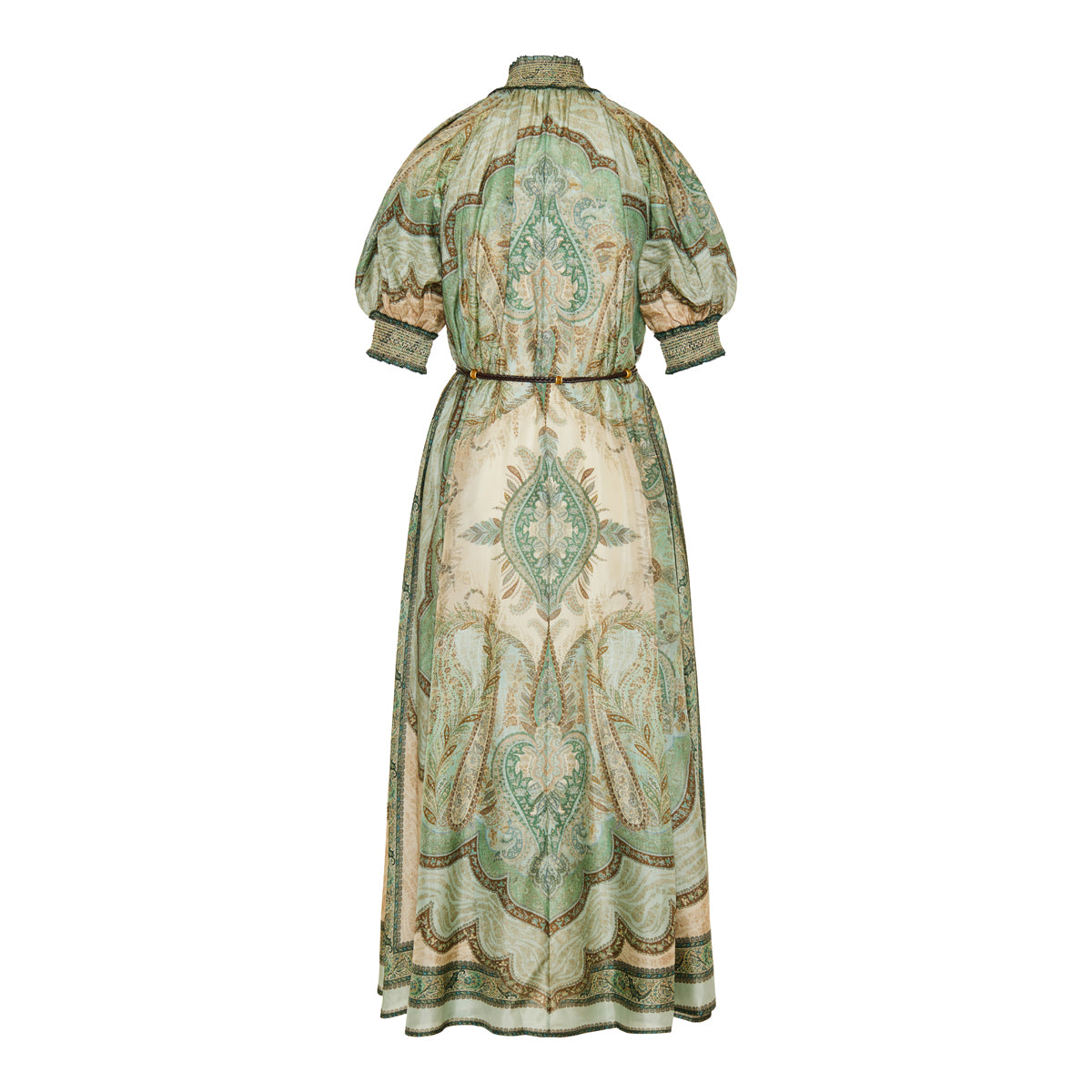 This silk maxi dress by Zimmermann features a rich tapestry‑teal multicolour print, a shirred stand collar, short billowed sleeves and a detachable rope belt — ideal for elevated resort wear or refined summer evenings.