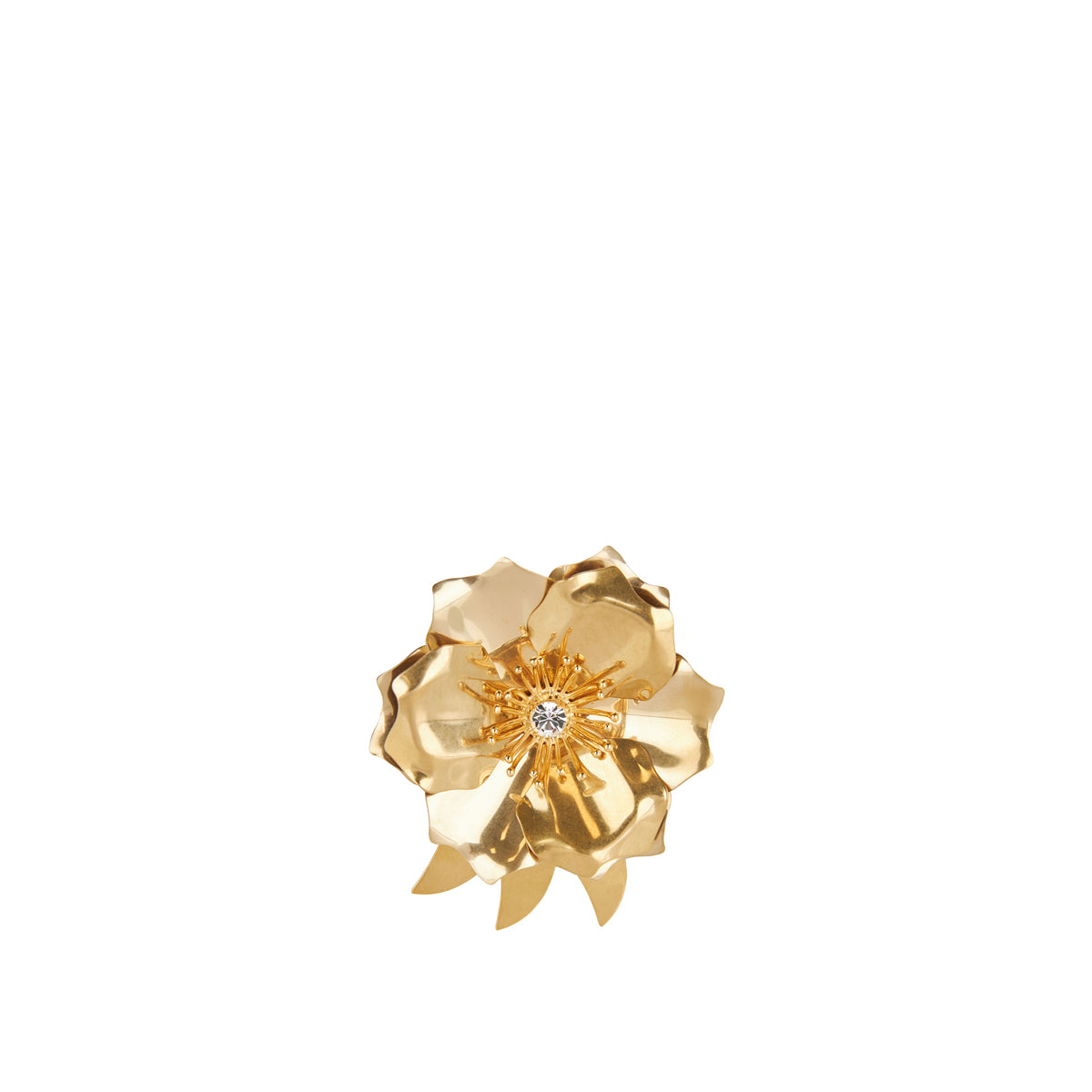 A sculptural brooch by Miu Miu in gold‑tone metal, set with a central crystal, ideal for refined finishing touches on luxury outerwear or evening attire.
