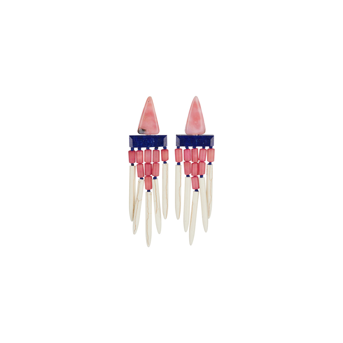 These sculptural Monies earrings combine Andean opal, lapis lazuli, shell, and bone in a multicolored arrangement of pink, white, and purple hues. Their organic shapes and artisanal construction create a bold yet elegant statement, ideal for formal events, evening occasions, or gallery-inspired styling. A wearable expression of natural beauty and refined craftsmanship.