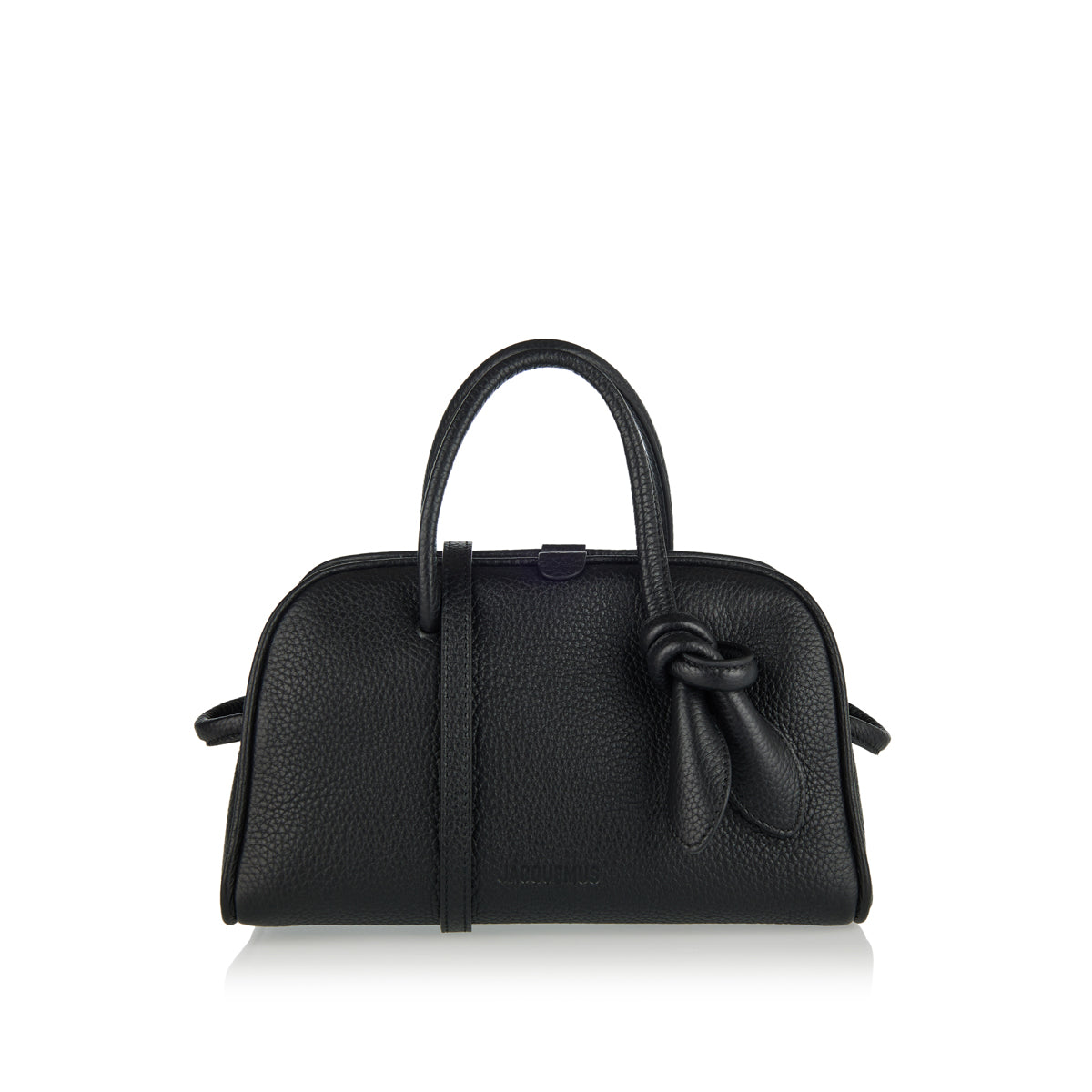 This soft bowling bag from Jacquemus is crafted in grained calfskin leather and accented with a sculpted bow detail. Featuring a two-way zip closure, an inside pocket, and a detachable adjustable shoulder strap, its compact form (26 × 16 × 11 cm) transitions beautifully between day and evening wear.