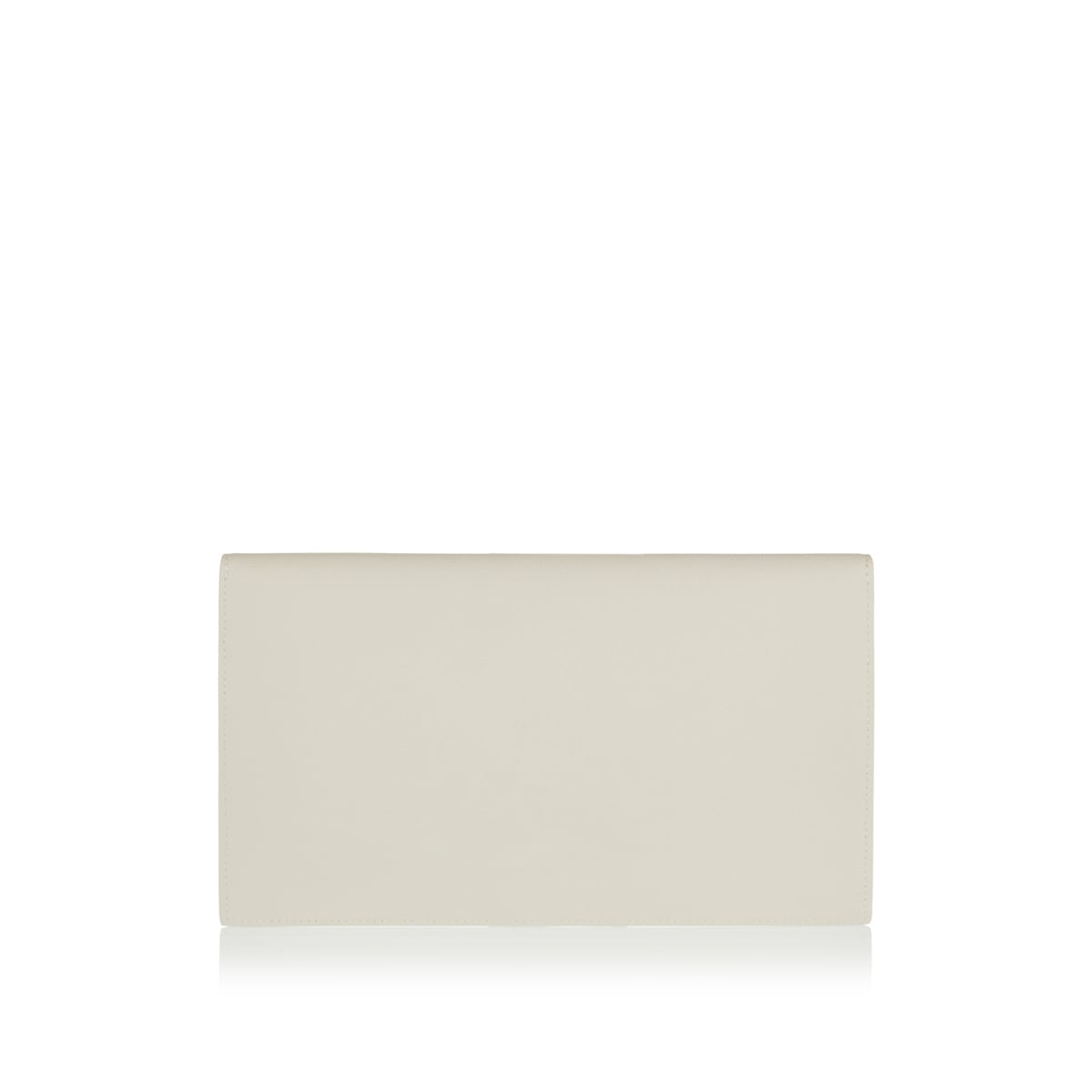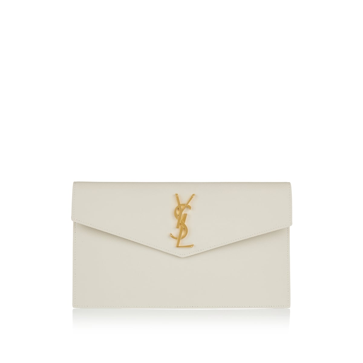 The Uptown clutch in grainy leather has a flat silhouette defined by the Cassandre embellishment. Pointed flap top, magnet closure and one compartment are its main features.