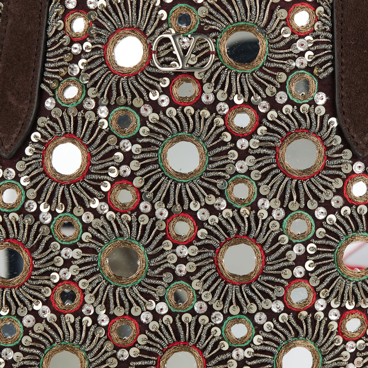 Valentino Garavani Nellcôte tote in brown suede, adorned with crystal embellishments for a striking finish. The spacious silhouette combines refined detailing with practical function, featuring dual top handles, a suede-lined interior, and leather trims. A luxurious statement bag designed to elevate both day and evening ensembles.