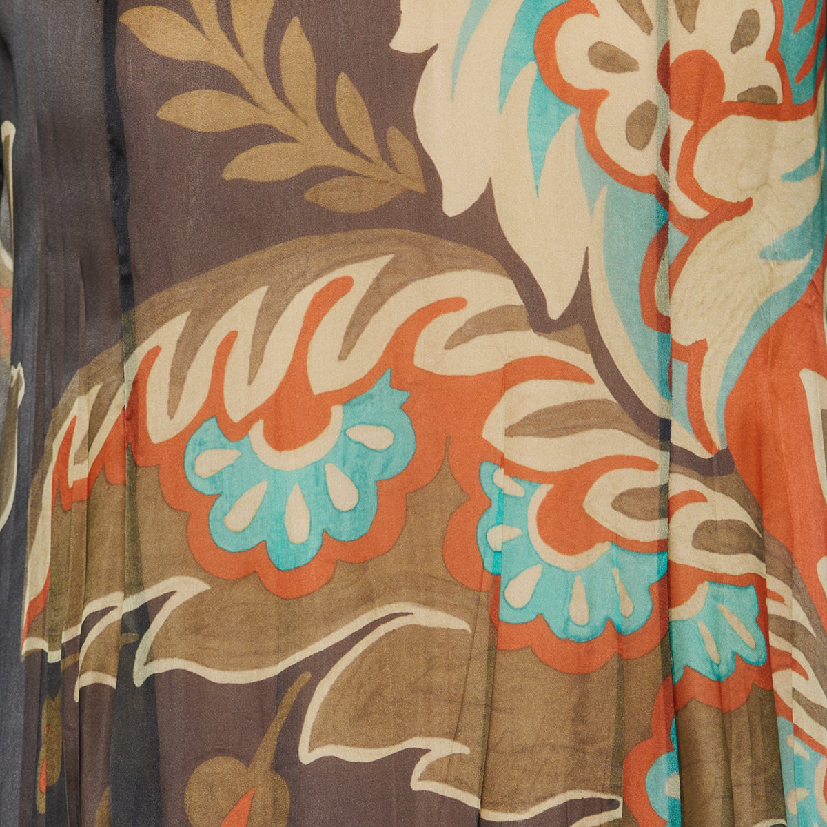 This mini dress features a dark brown floral print, crafted from 100% silk. It is designed with a pleated skirt, bell sleeves, and a round neck, offering a blend of elegance and contemporary style. Made in Italy.