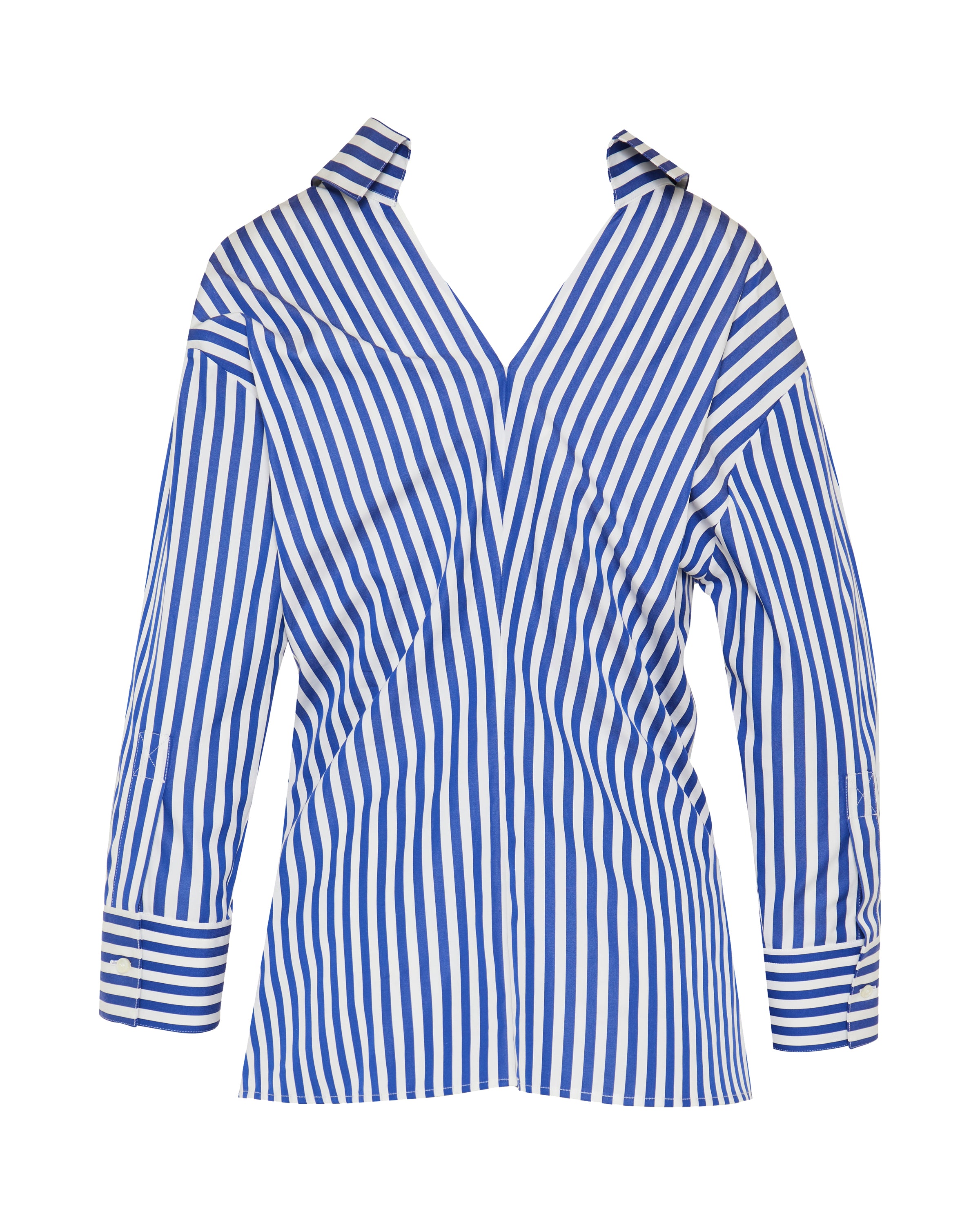 Crisp poplin shirt defined by a striped pattern and slashed detailing, bringing a modern, deconstructed edge to classic shirting.