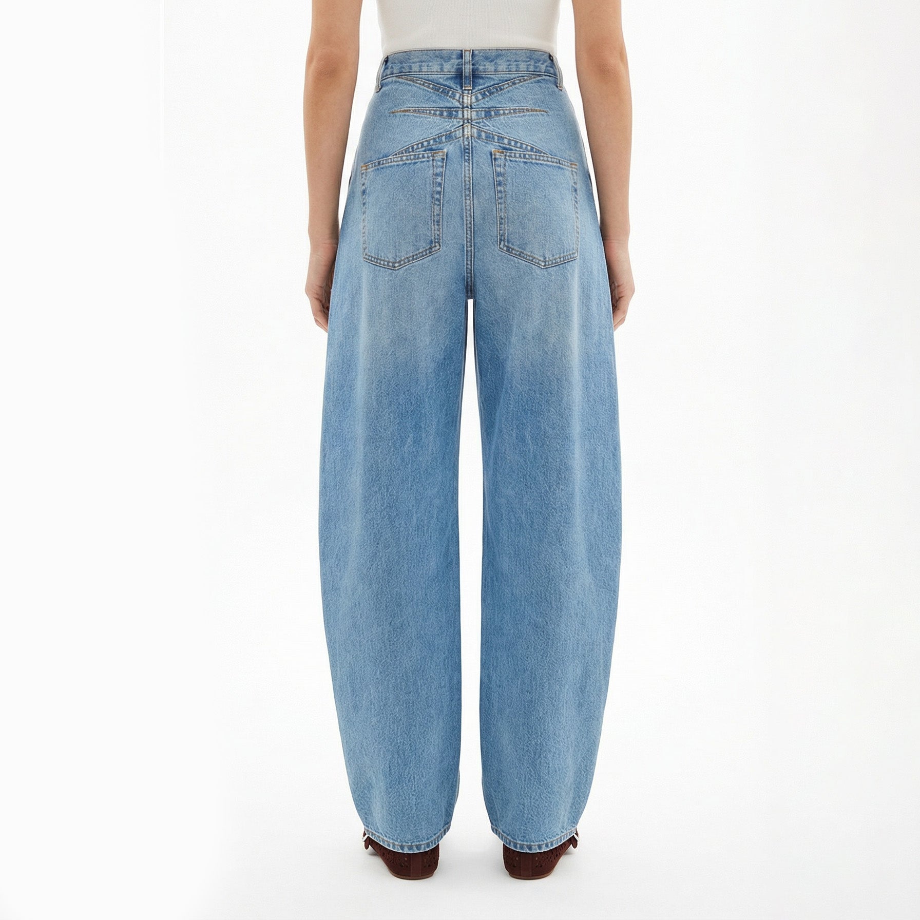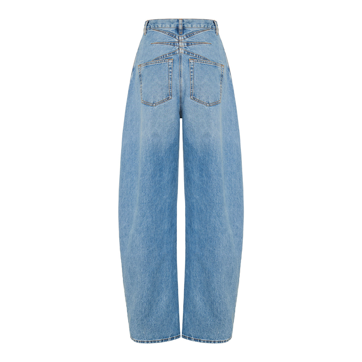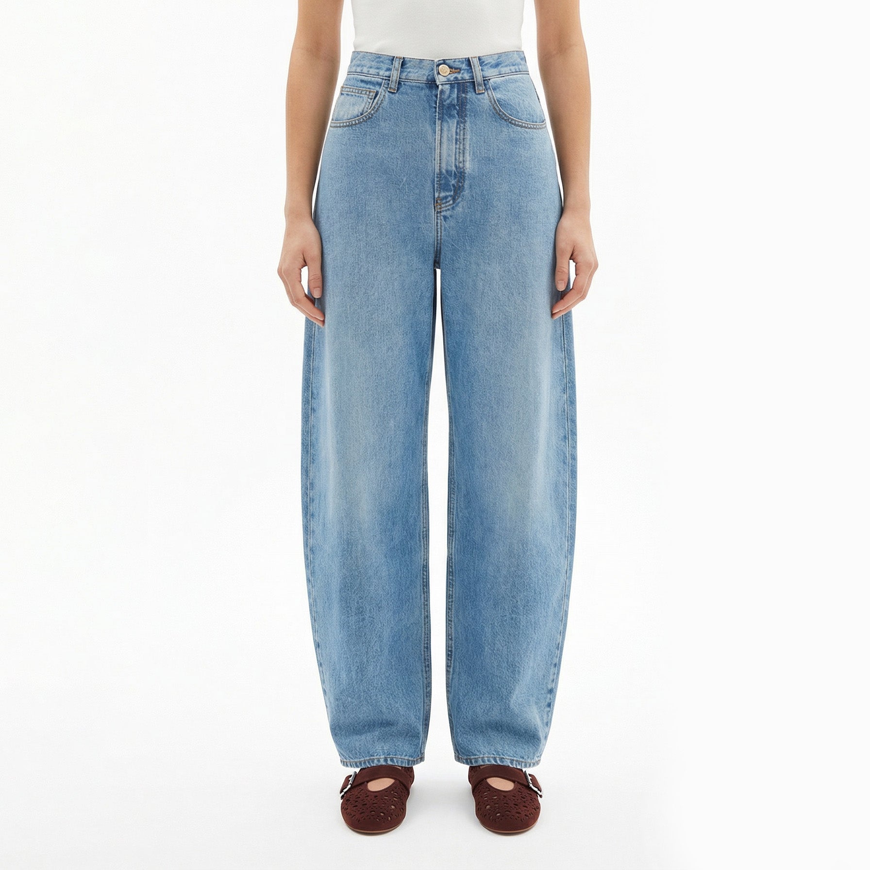 High-waisted barrel-leg denim trousers with a softly curved silhouette that balances structure and volume. Cut from faded blue denim with five-pocket styling, zip-fly and button closure, and signature rear darts, they blend sculptural tailoring with casual ease. Ideal for elevated everyday looks when paired with tailored tops or relaxed knits.