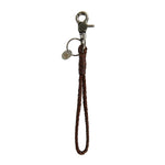 A compact key clip crafted from braided leather, defined by a structured silhouette and refined hardware detailing.