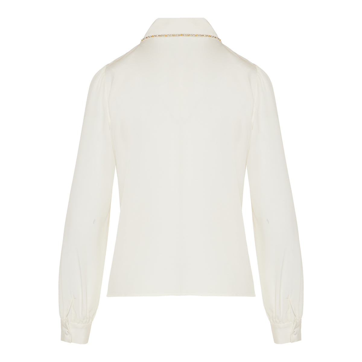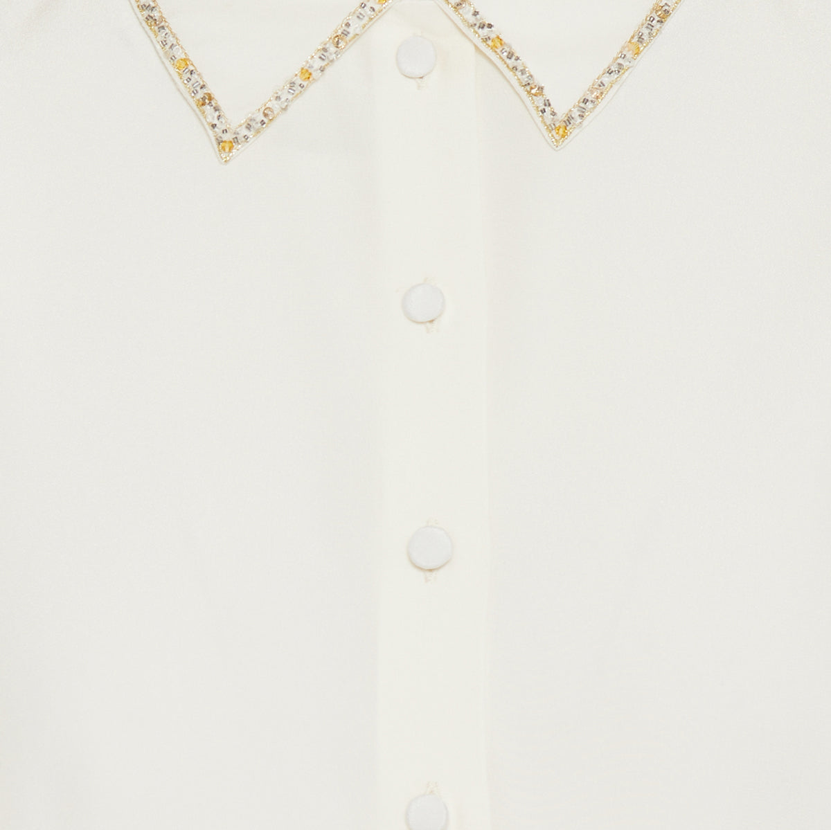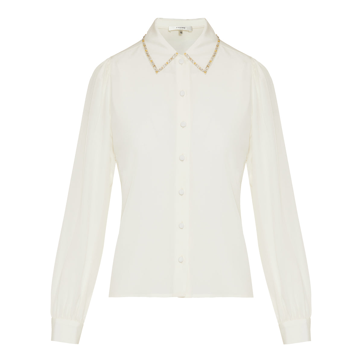 This Frame Embellished Silk Button-Up Shirt is a refined piece ideal for both elegant daywear and polished evening looks. Made from supple silk, it features delicate bead detailing tracing the edges of a point collar, adding subtle glamour to a timeless silhouette