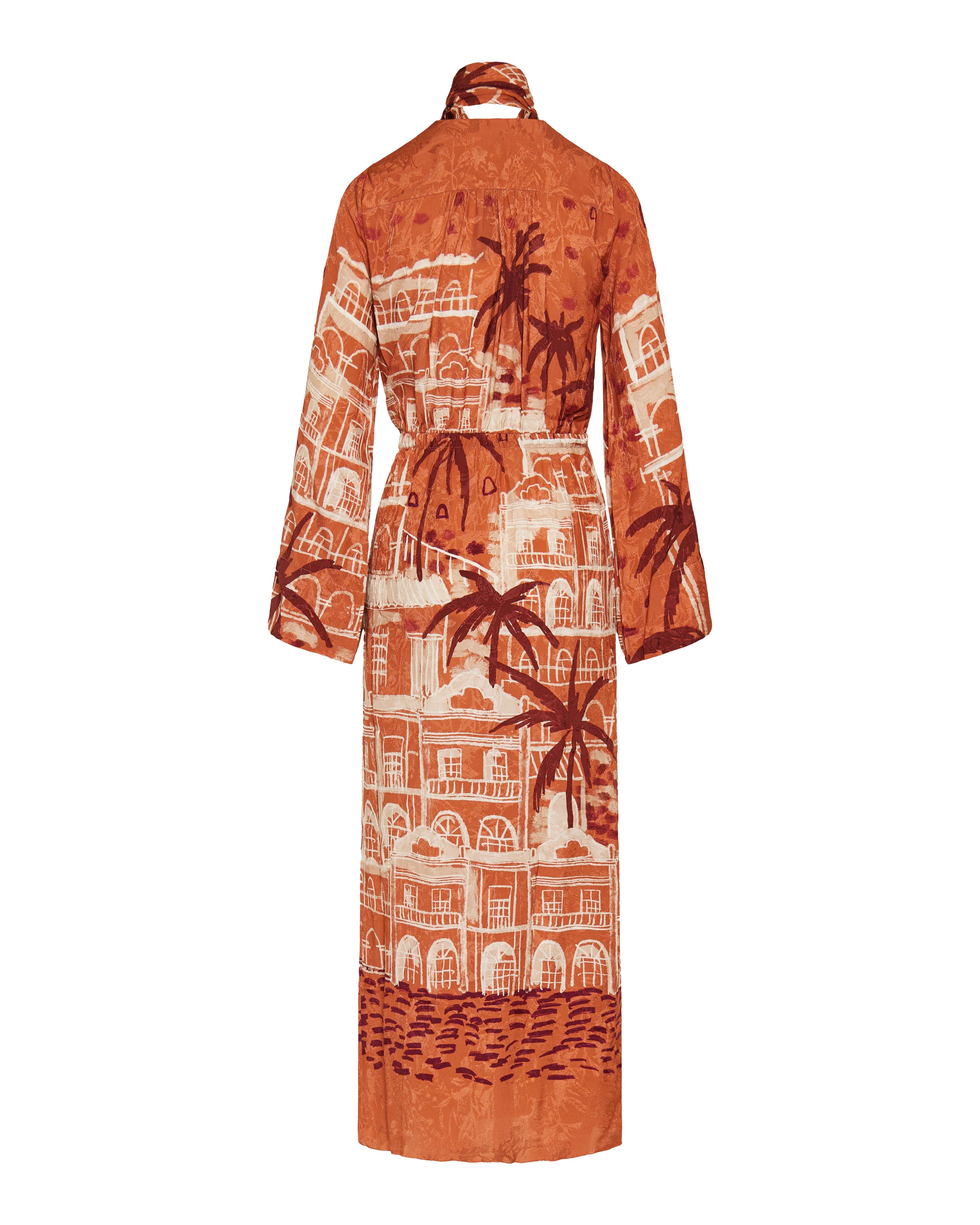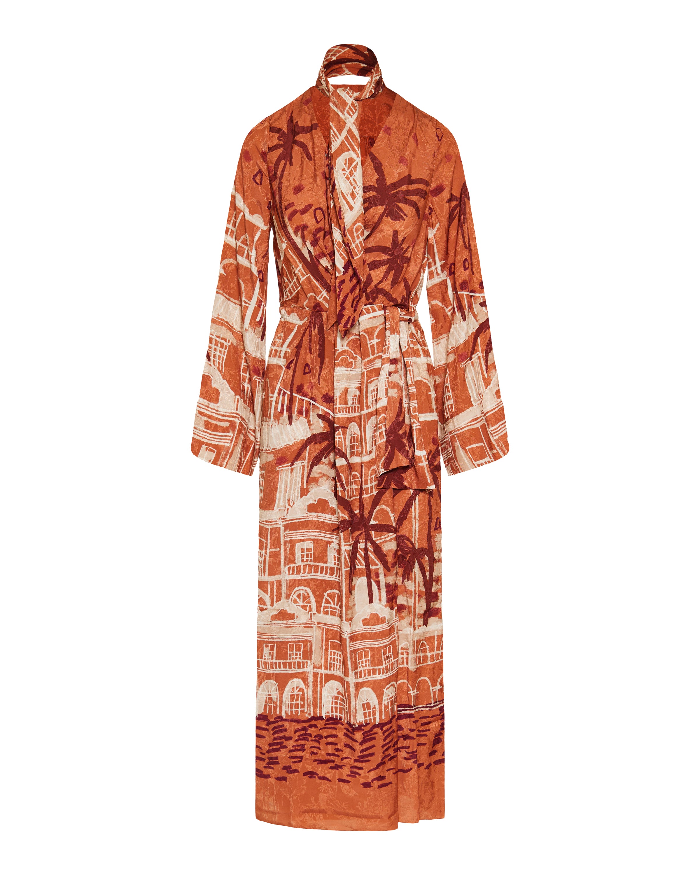 A wrap-around dress crafted in printed jacquard and adorned with one of Johanna Ortiz’s signature architectural landscape prints. It features a waist tie and coordinating scarf that add movement and sophistication—ideal for daytime gatherings or dinner occasions.