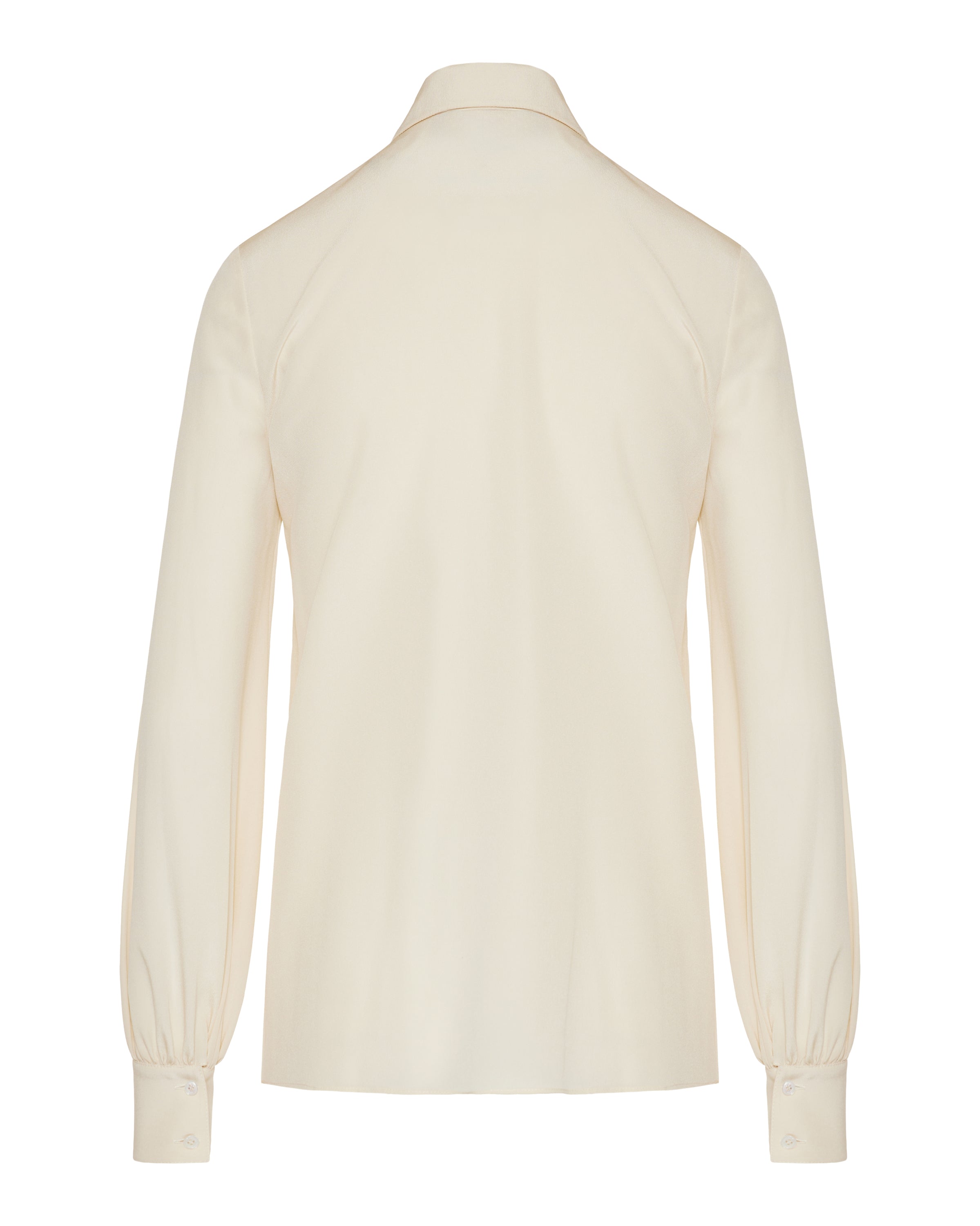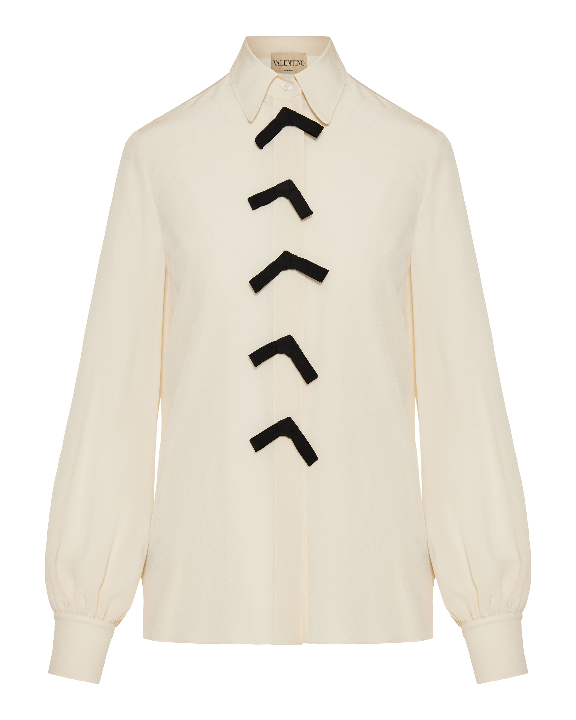An elegant white blouse in luxurious silk crepe de chine, detailed with contrasting mini bows along the concealed button placket for a refined feminine touch. Designed with a relaxed silhouette and artisanal craftsmanship, this piece brings contemporary sophistication to elevated daytime and refined evening wear.