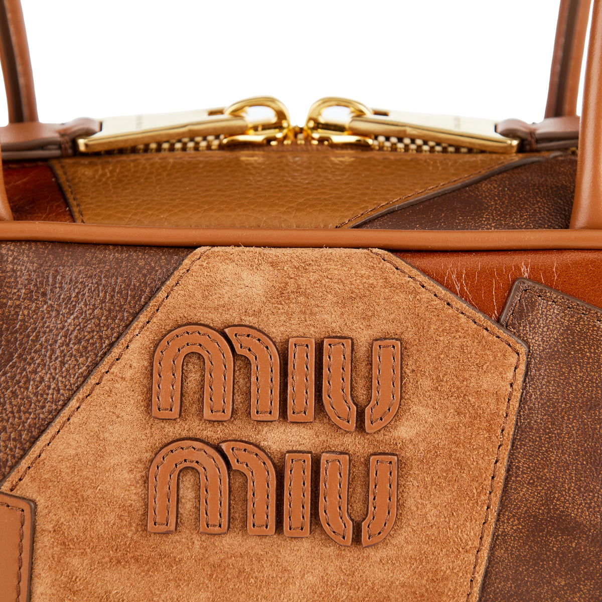 A compact top-handle bag crafted from patchwork lambskin, featuring a leather lettering logo, gold-tone hardware, and a zip closure.