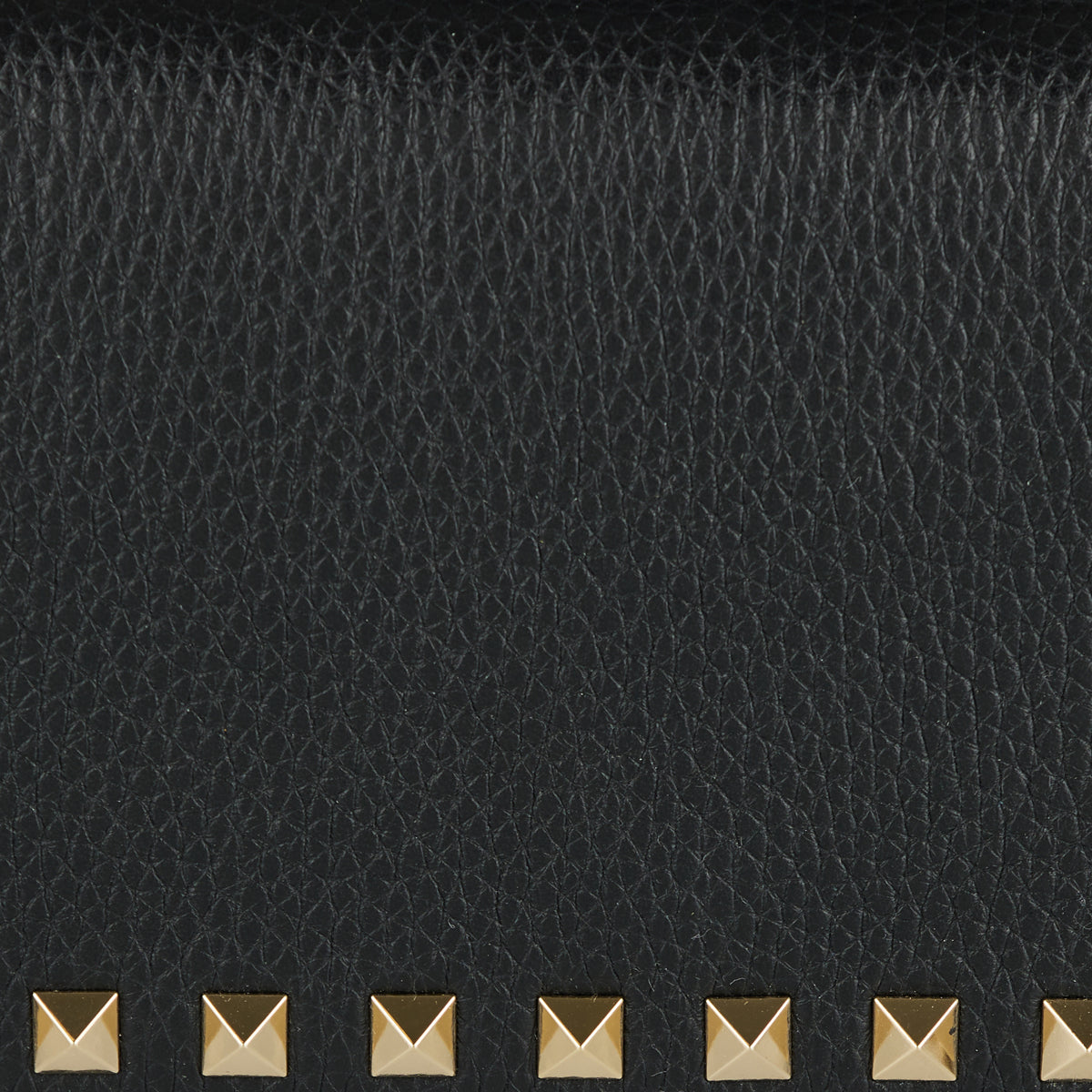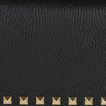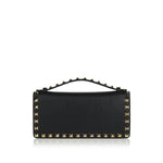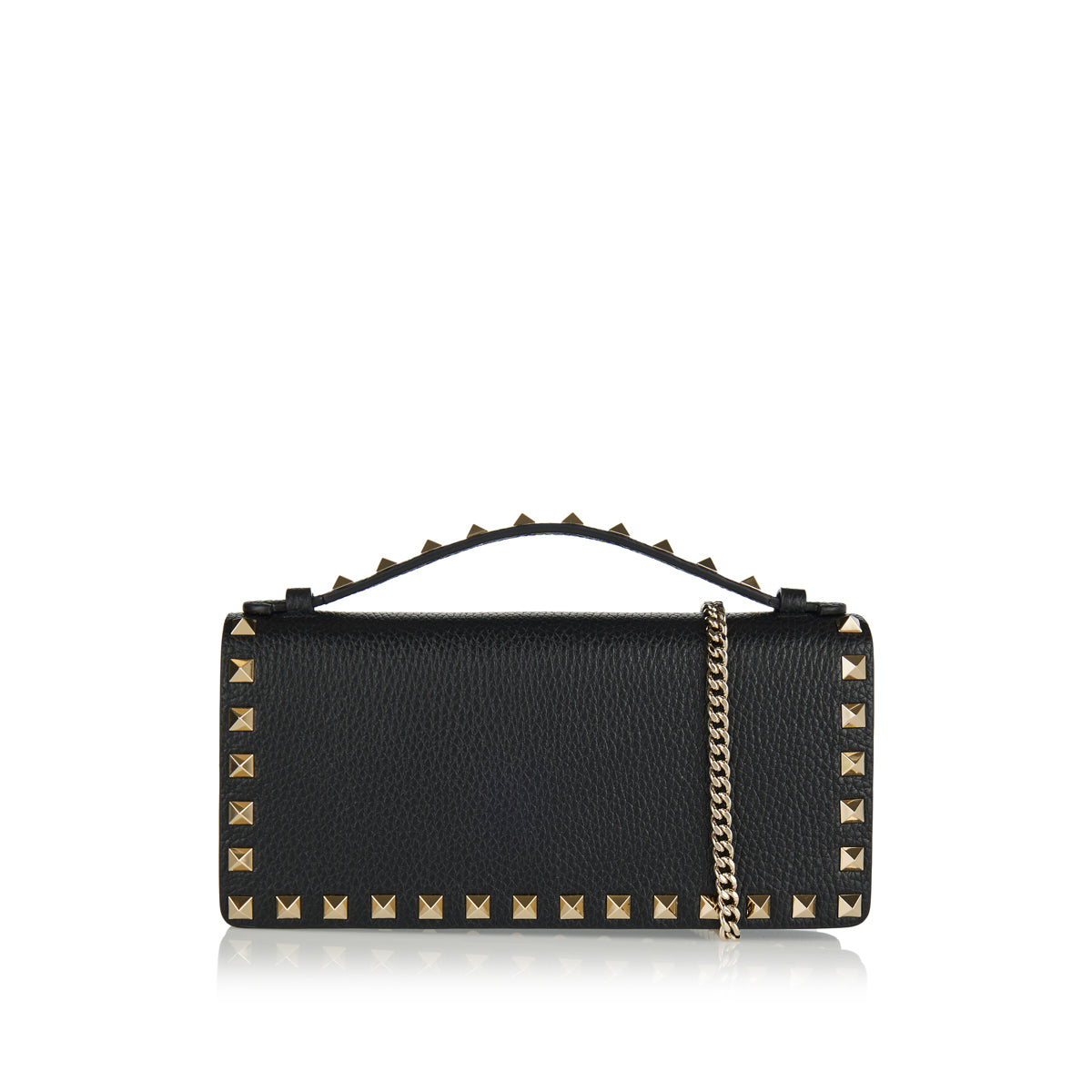 The Valentino Garavani Rockstud embellished clutch bag is a luxurious accessory crafted from 100% calf leather. It features a foldover top with magnetic fastening, a flat top handle, and a detachable chain-link shoulder strap, perfect for adaptable styling. Finished in black with gold-tone Rockstud accents, it’s ideal for both elegant daytime looks and evening events.