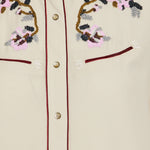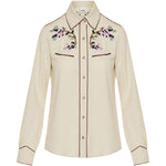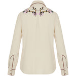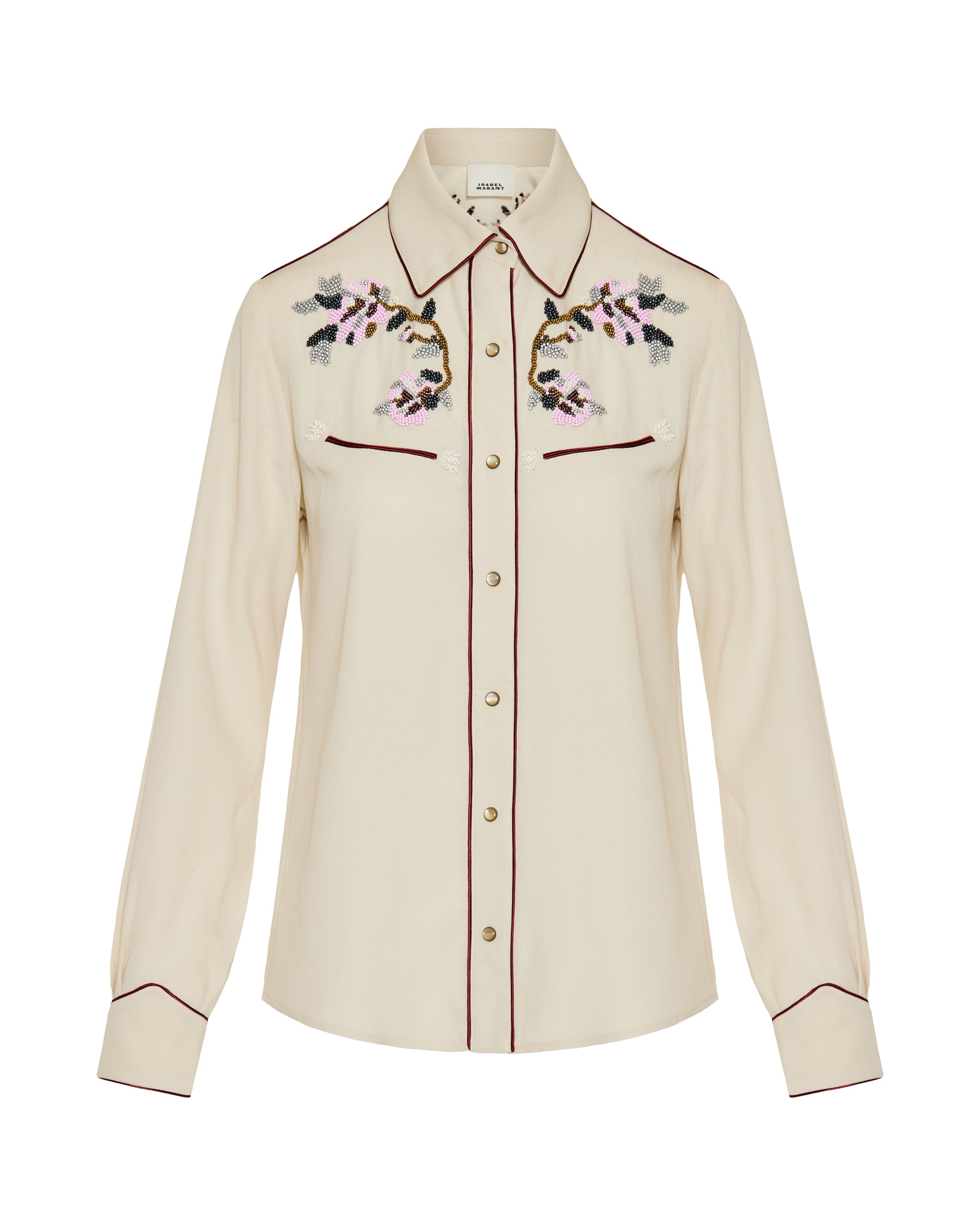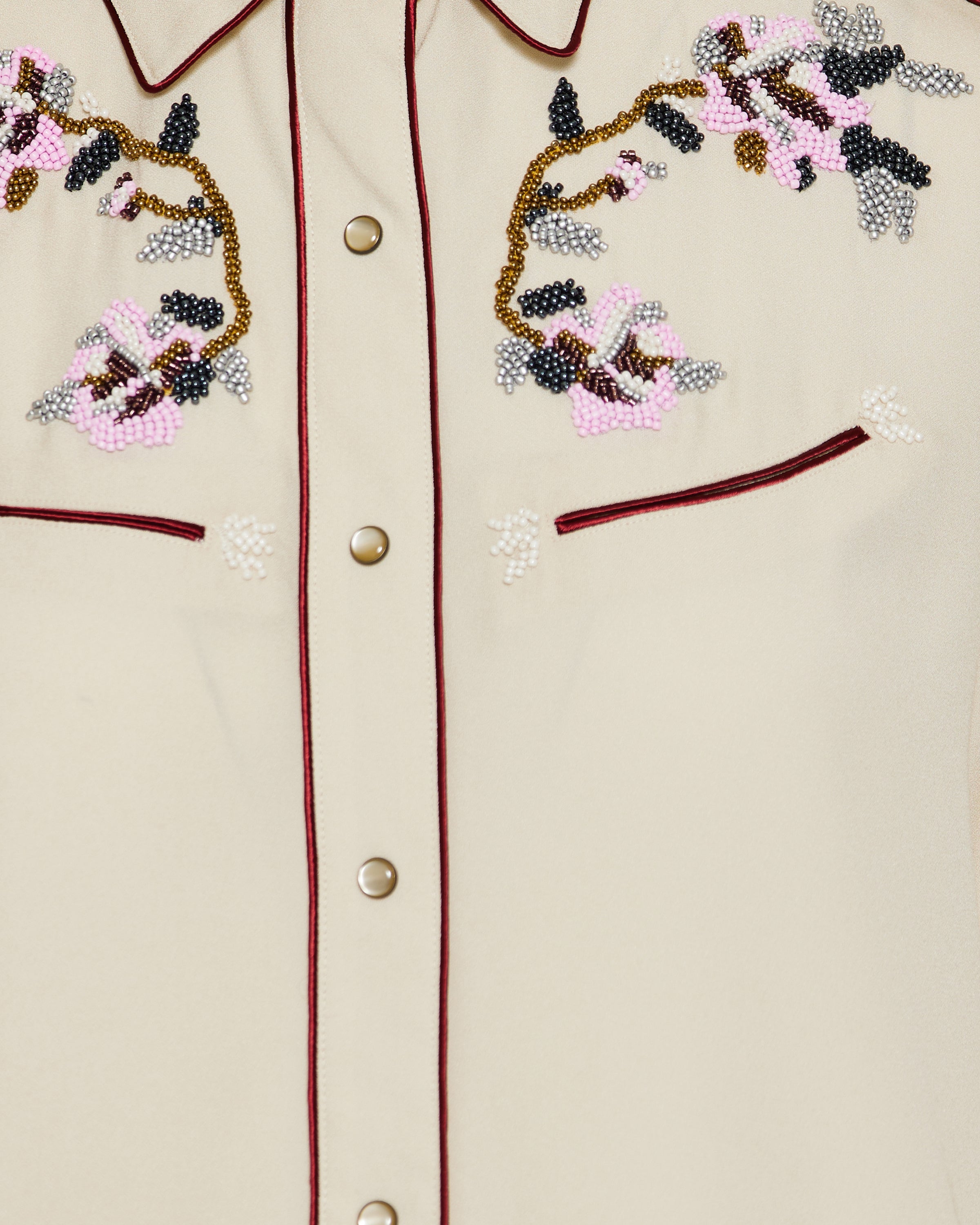 A refined ecru shirt adorned with delicate bead and embroidery detailing for elevated texture and subtle sophistication. The tailored silhouette and button‑through fastening create versatile elegance for elevated casual and refined daytime wear. This piece brings artisanal accents and modern French chic to contemporary wardrobes.