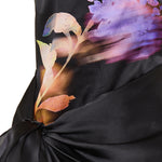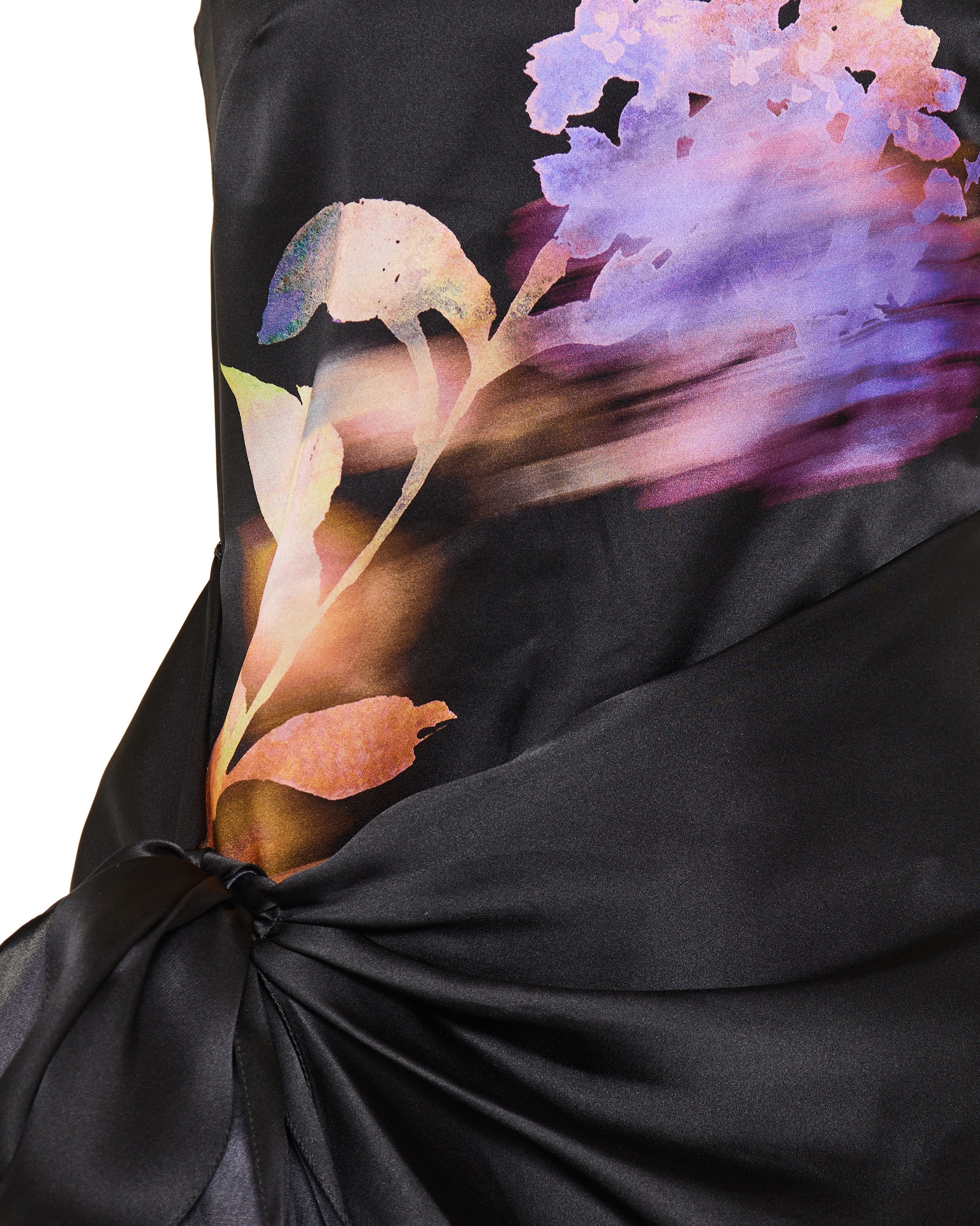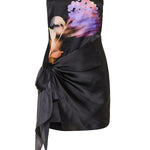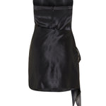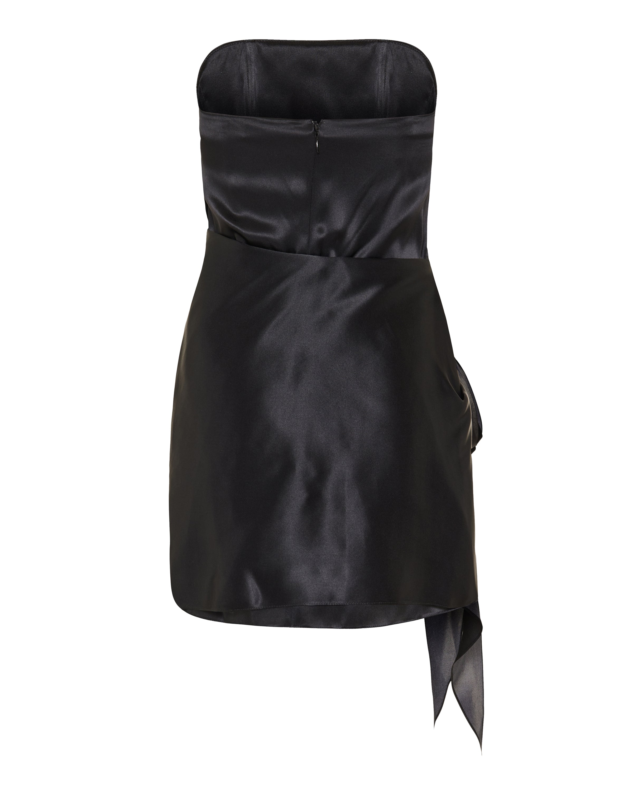 A sculpted mini dress in silk, defined by a strapless neckline and striking front-tie detail.