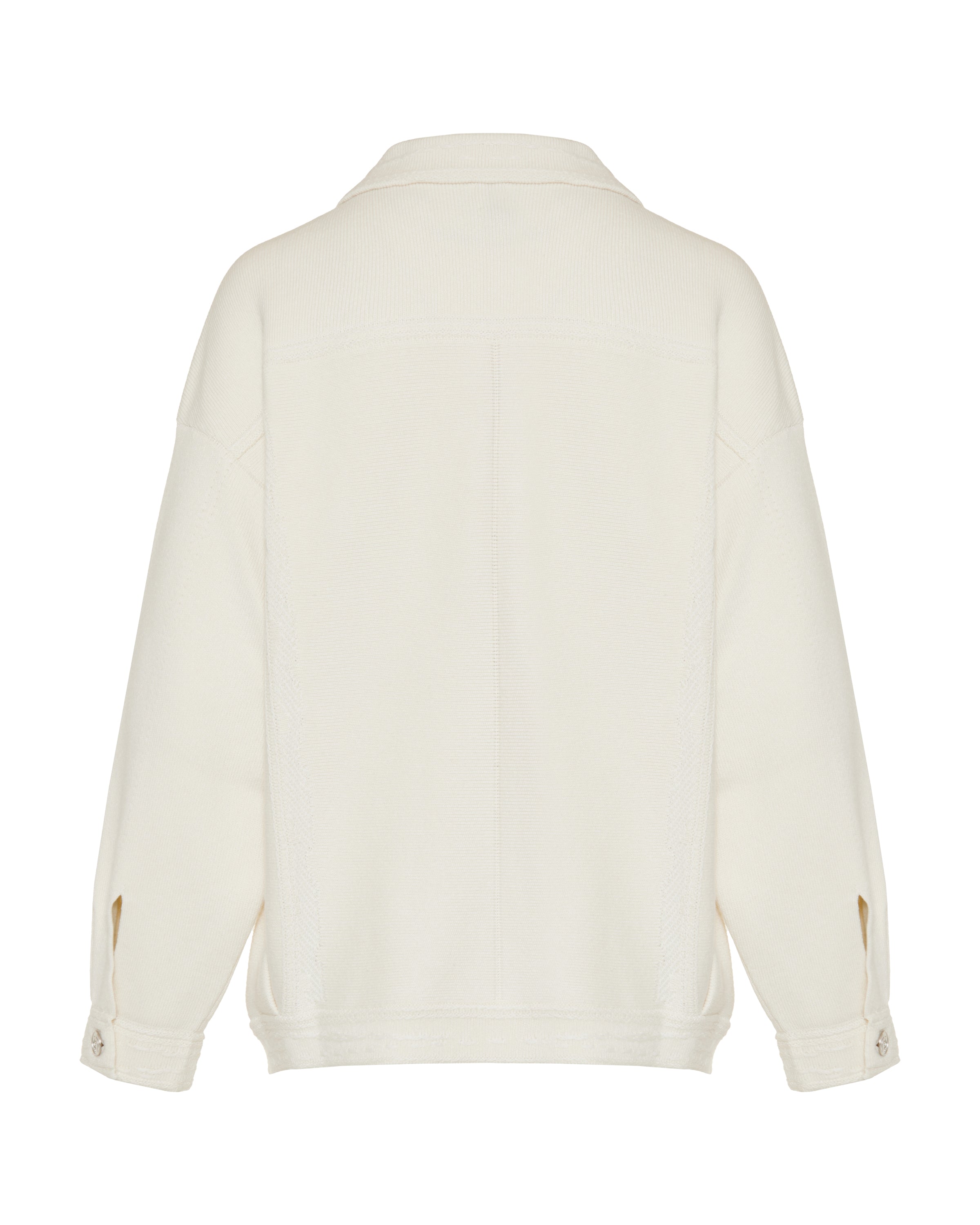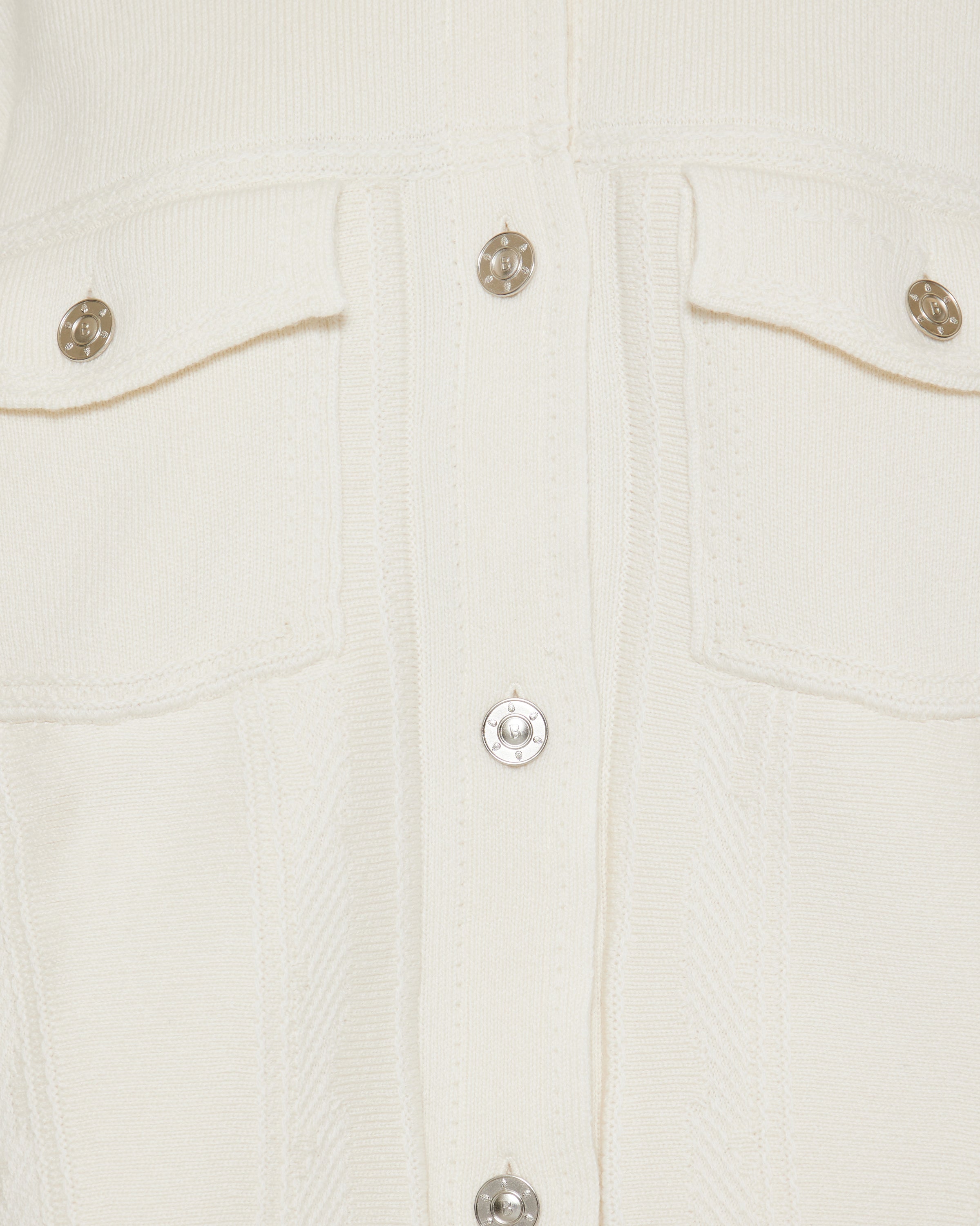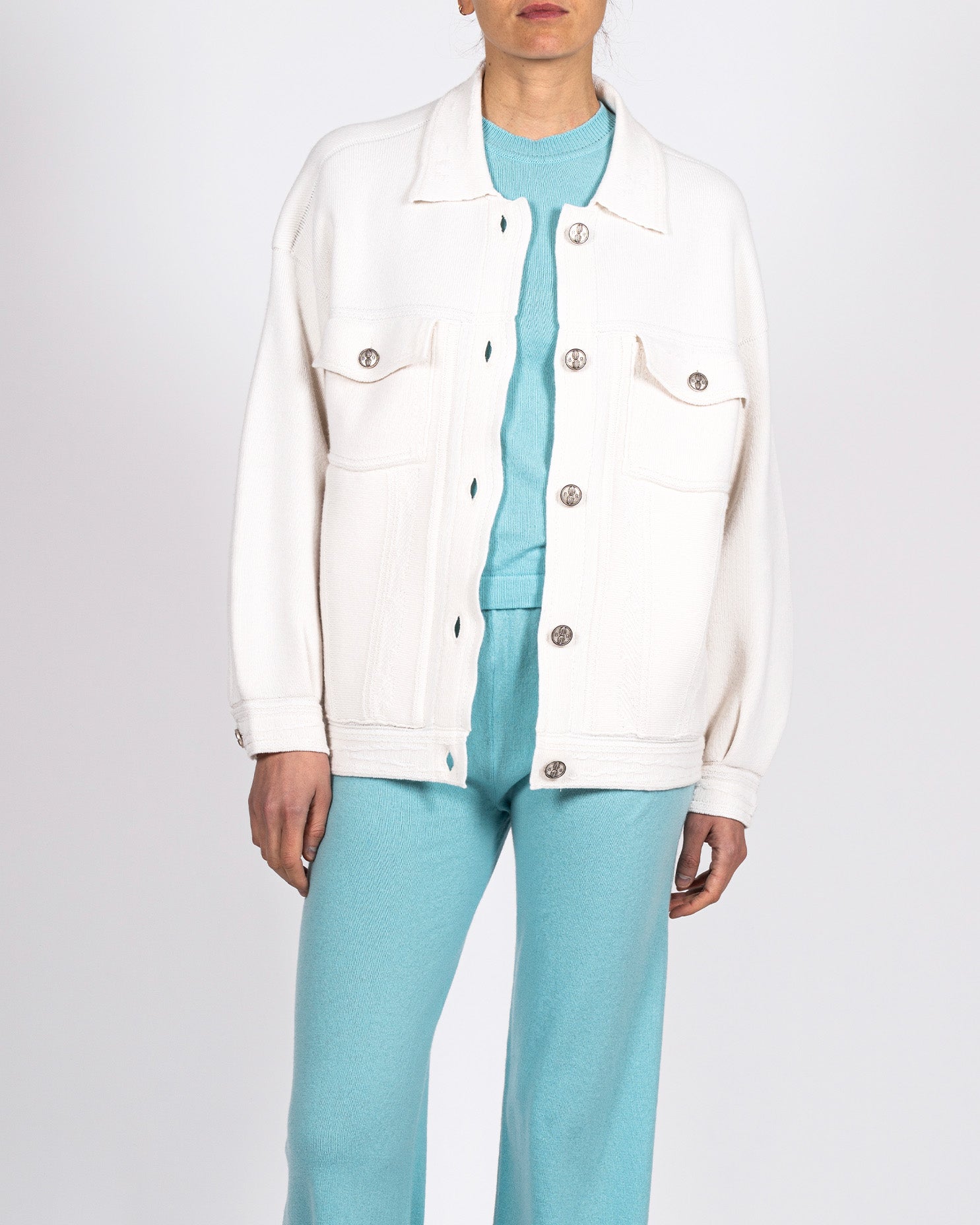 An artisanal Barrie contrast‑stitching denim‑effect jacket in cashmere‑cotton knit featuring a classic collar, front button fastening and long sleeves with buttoned cuffs. Designed for refined smart‑casual wardrobes, it reinterprets the iconic denim silhouette through luxurious knit craftsmanship and tailored detailing.