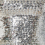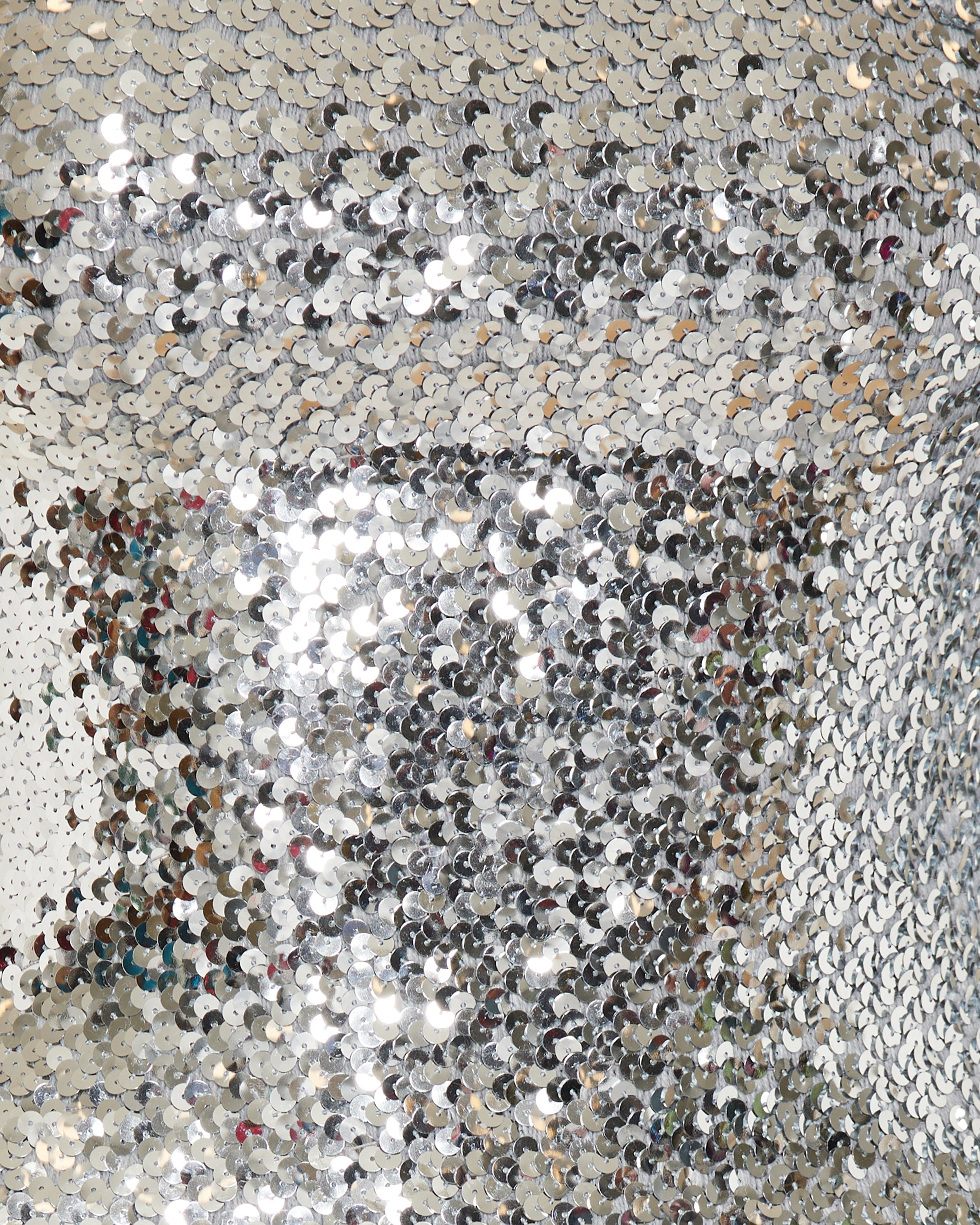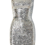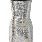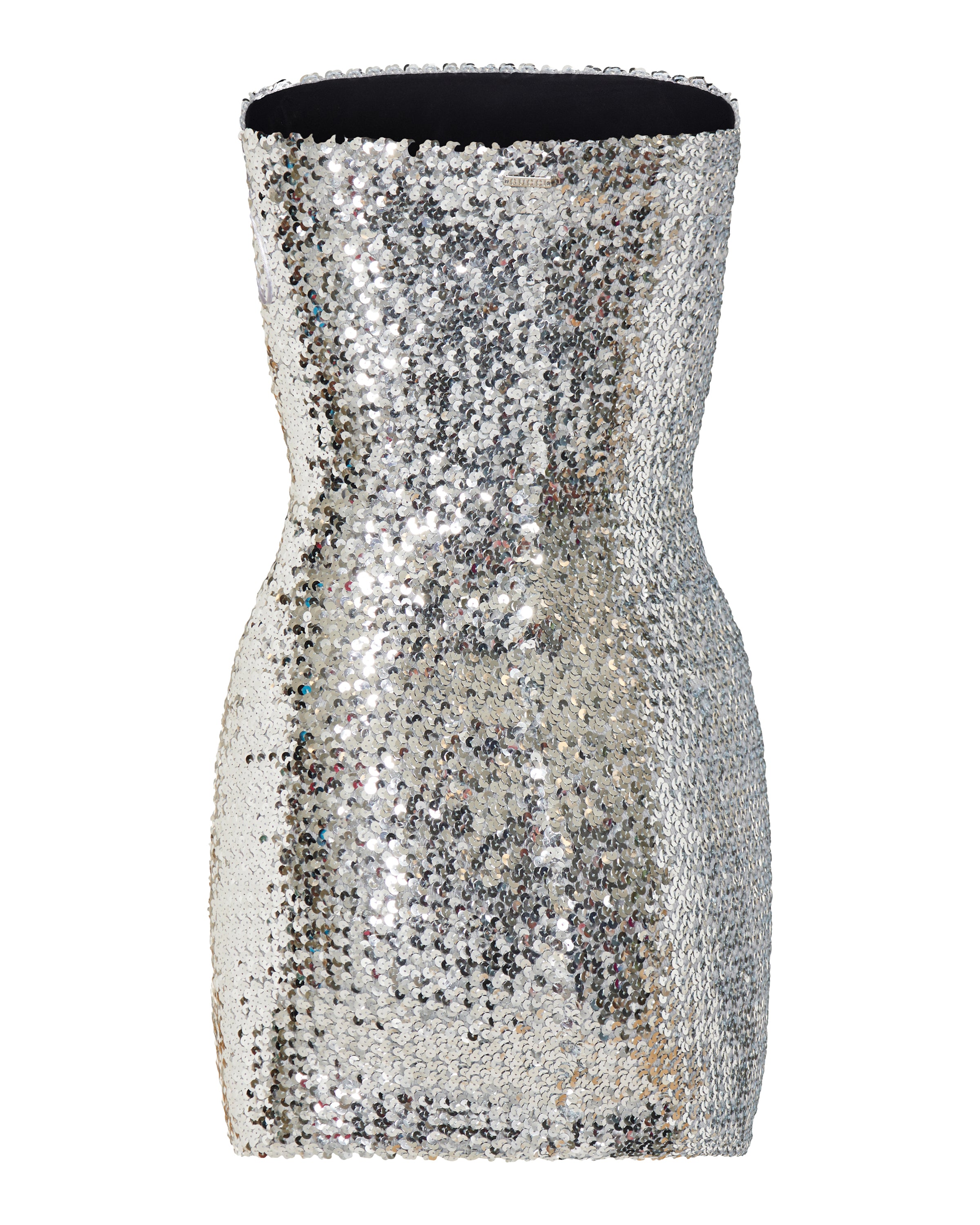 A strapless mini dress fully embellished with sequins, designed to reflect light with every movement.