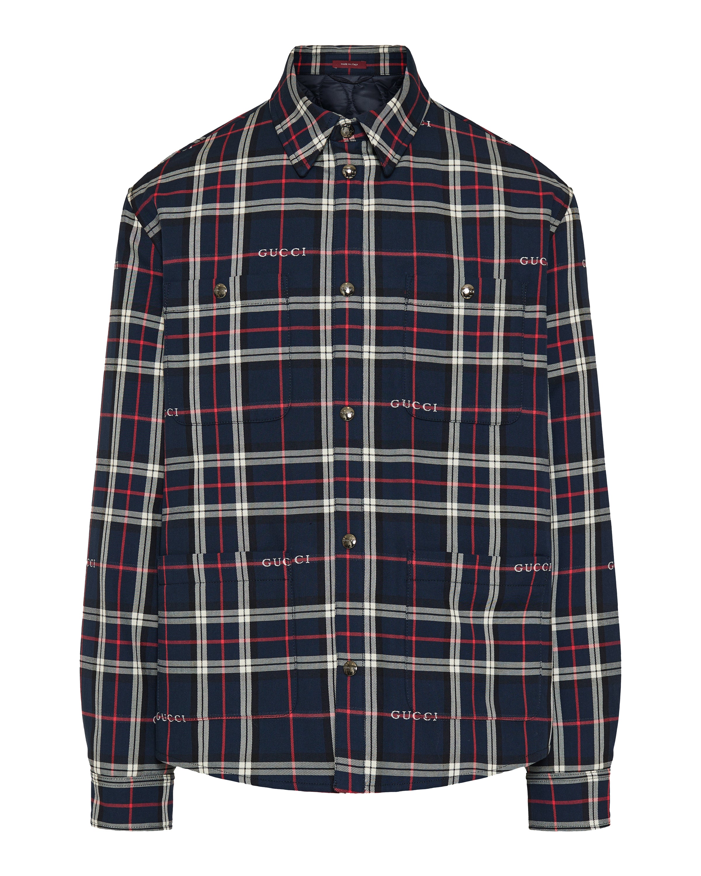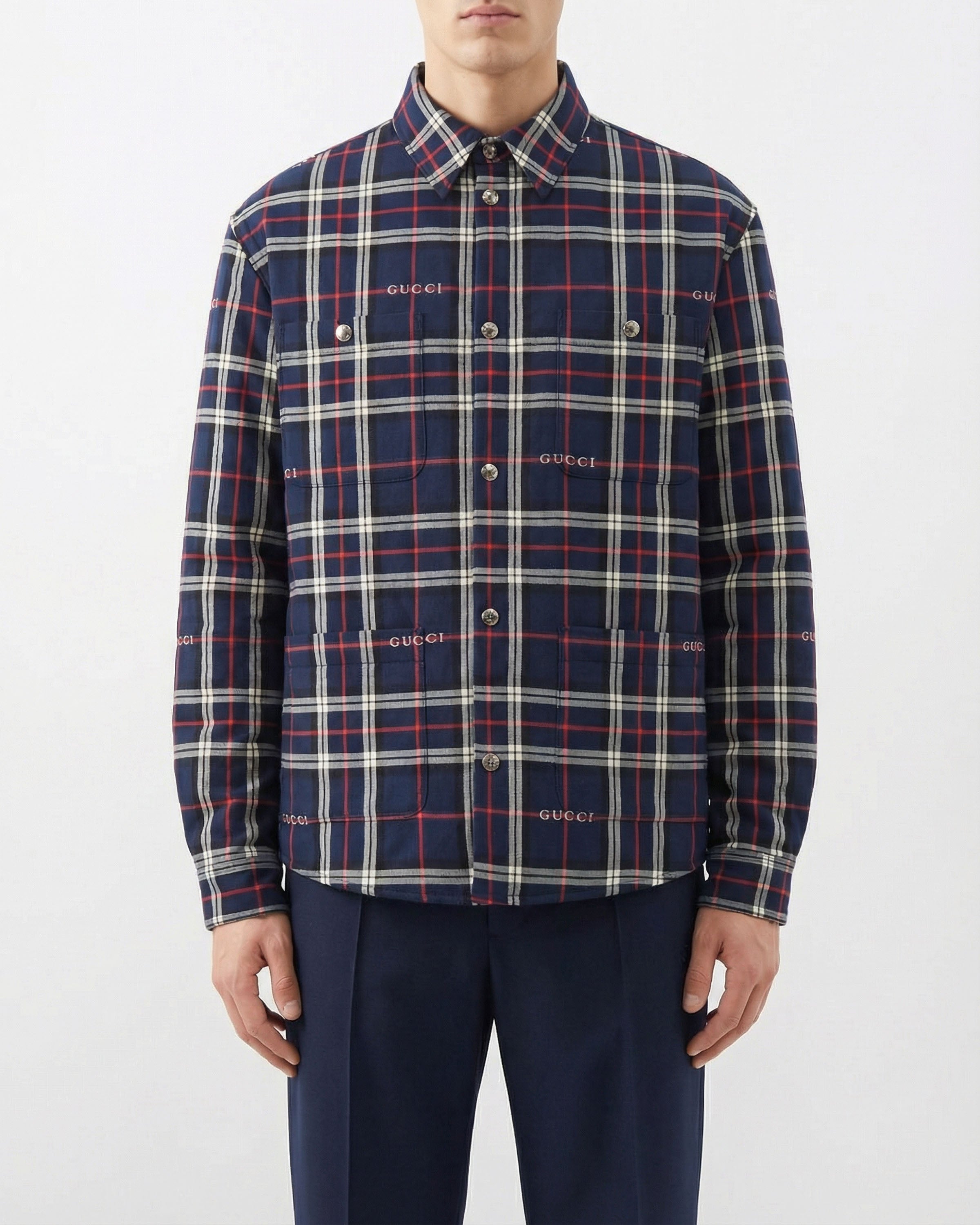Blending classic pattern with contemporary construction, this padded shirt reflects Gucci’s elevated approach to outerwear-inspired tailoring. Crafted from cotton jacquard, it features a structured silhouette with light padding that adds dimension and warmth without bulk. Refined yet relaxed, it is suitable for everyday wear, transitional layering, and modern city styling, offering a distinctive balance of comfort and polished character.
