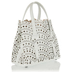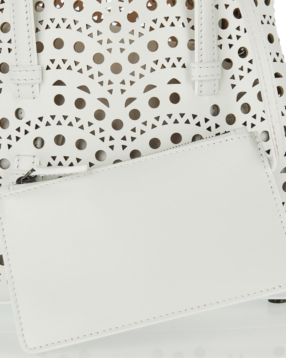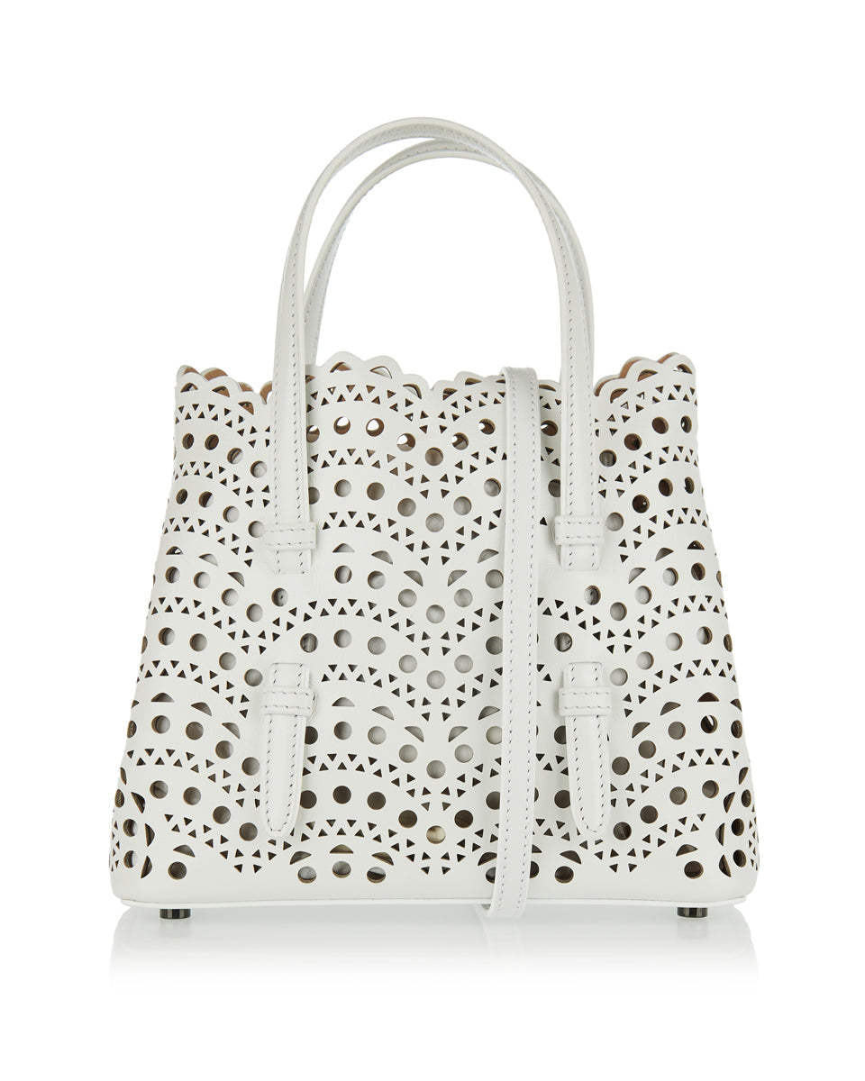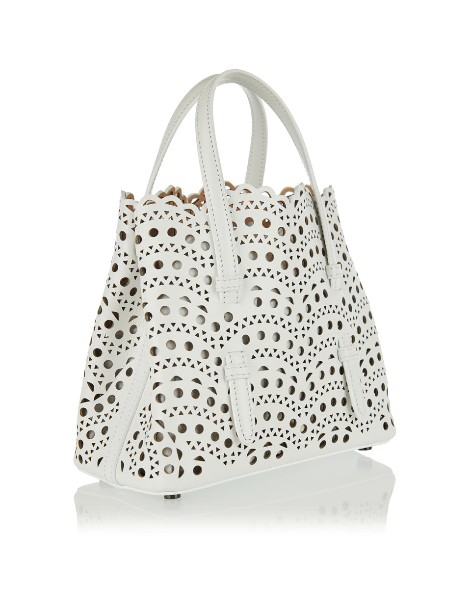 A sculptural top-handle bag crafted from smooth leather, defined by Alaïa’s signature architectural silhouette and refined perforated detailing. Compact yet distinctive, it brings a bold, modern edge to elevated everyday styling.
