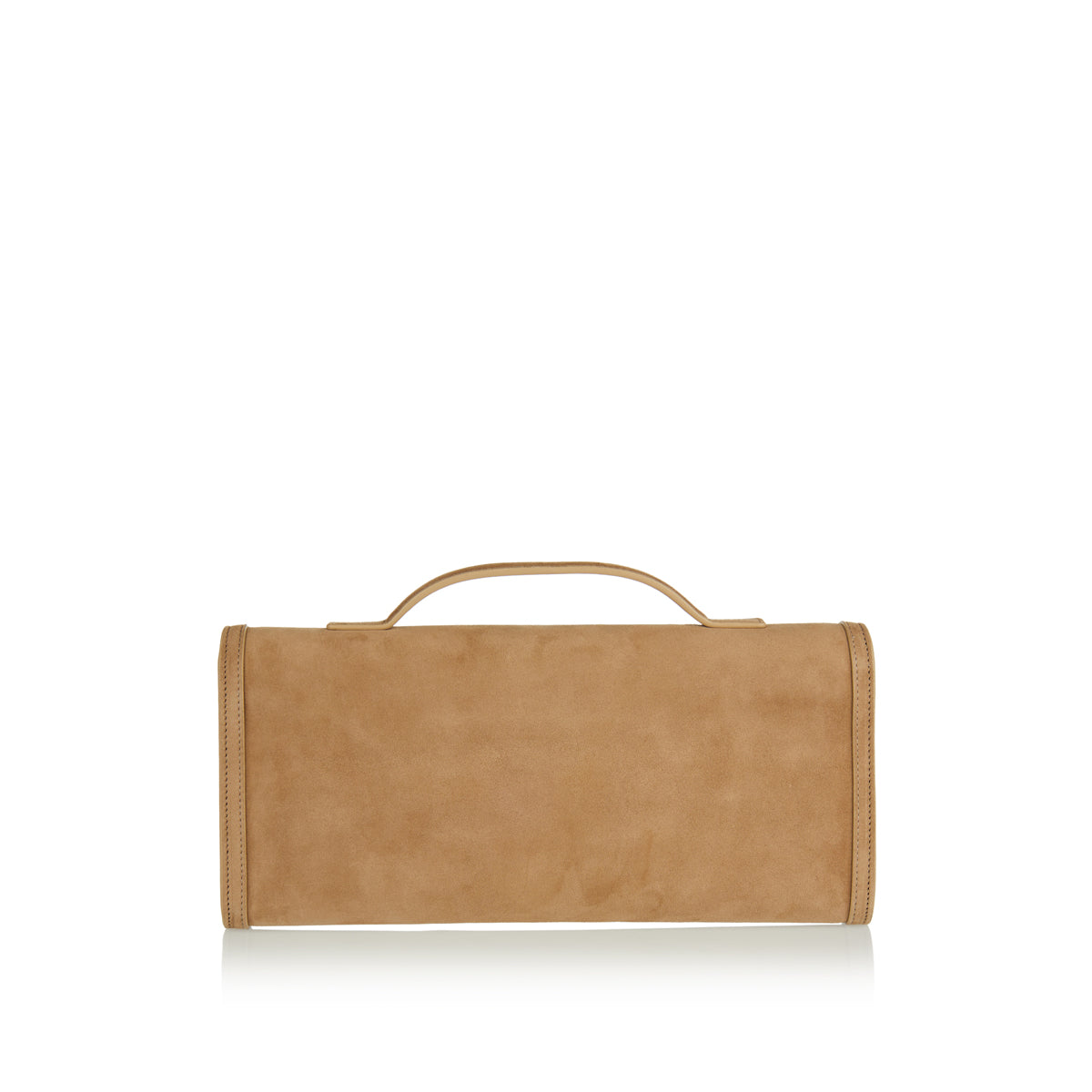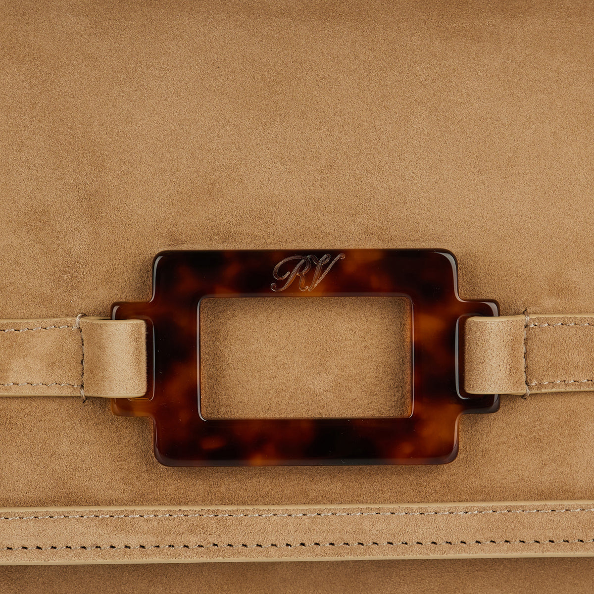 The Roger Vivier Belle Vivier Clutch in suede features a sleek, structured silhouette with a signature resin buckle, magnetic closure, and dual carrying options—a top handle and a detachable chain strap. A refined accessory for evening elegance.