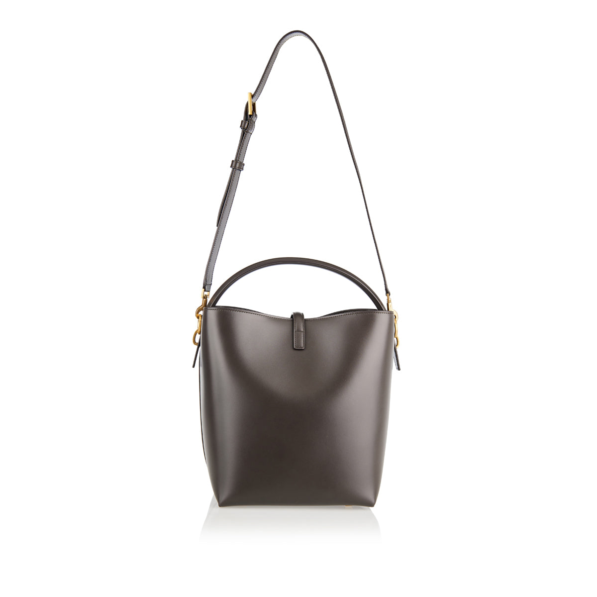 A bucket bag crafted from calfskin leather, featuring a Cassandre hook closure, top handle, and an adjustable and detachable shoulder strap.