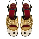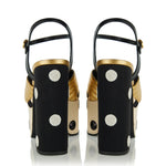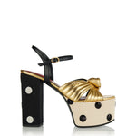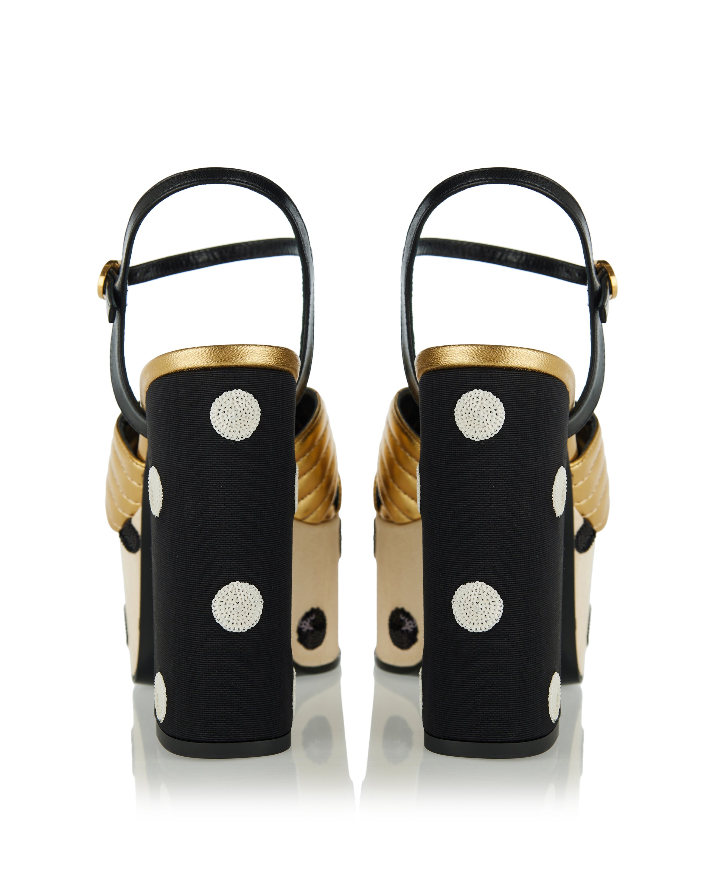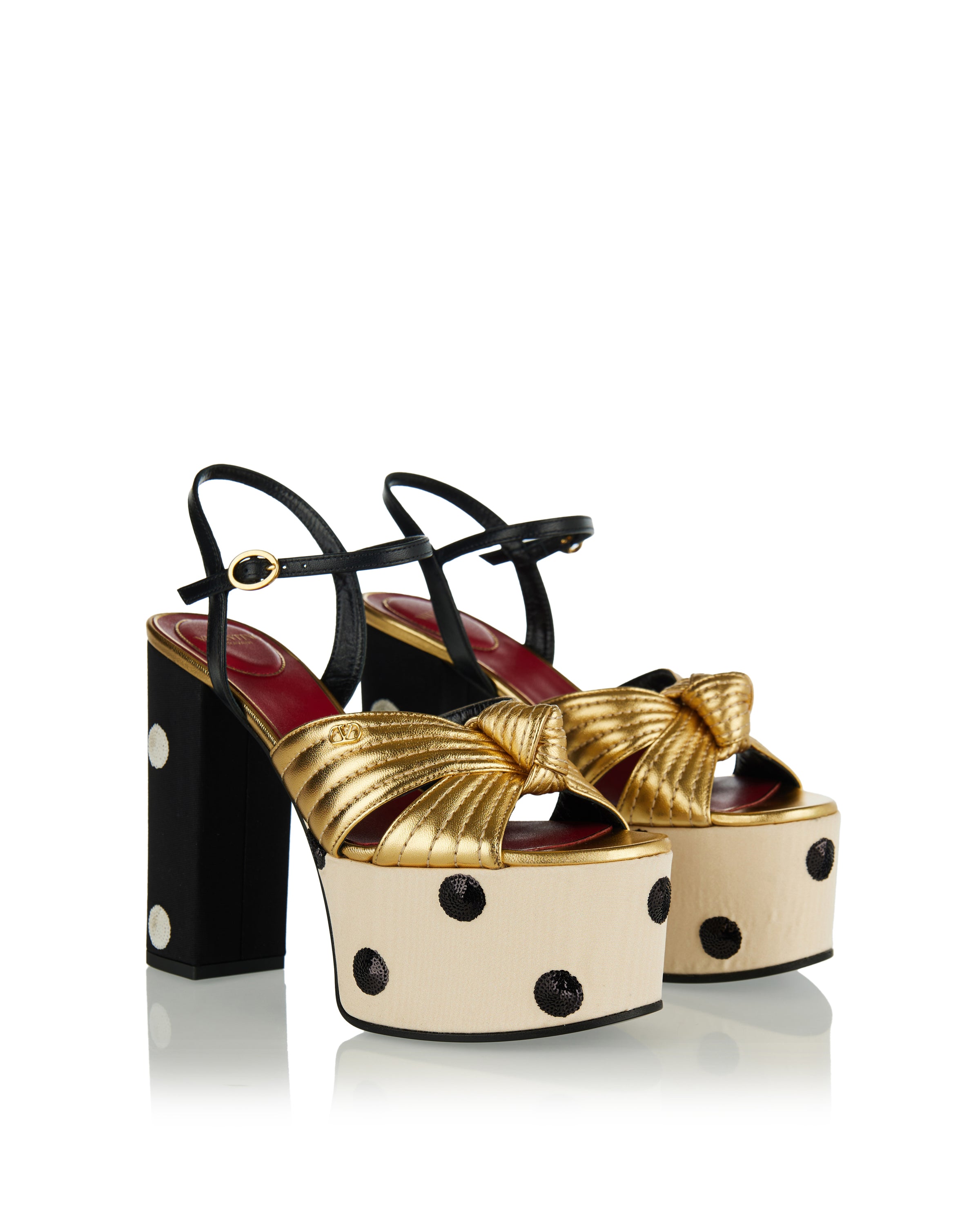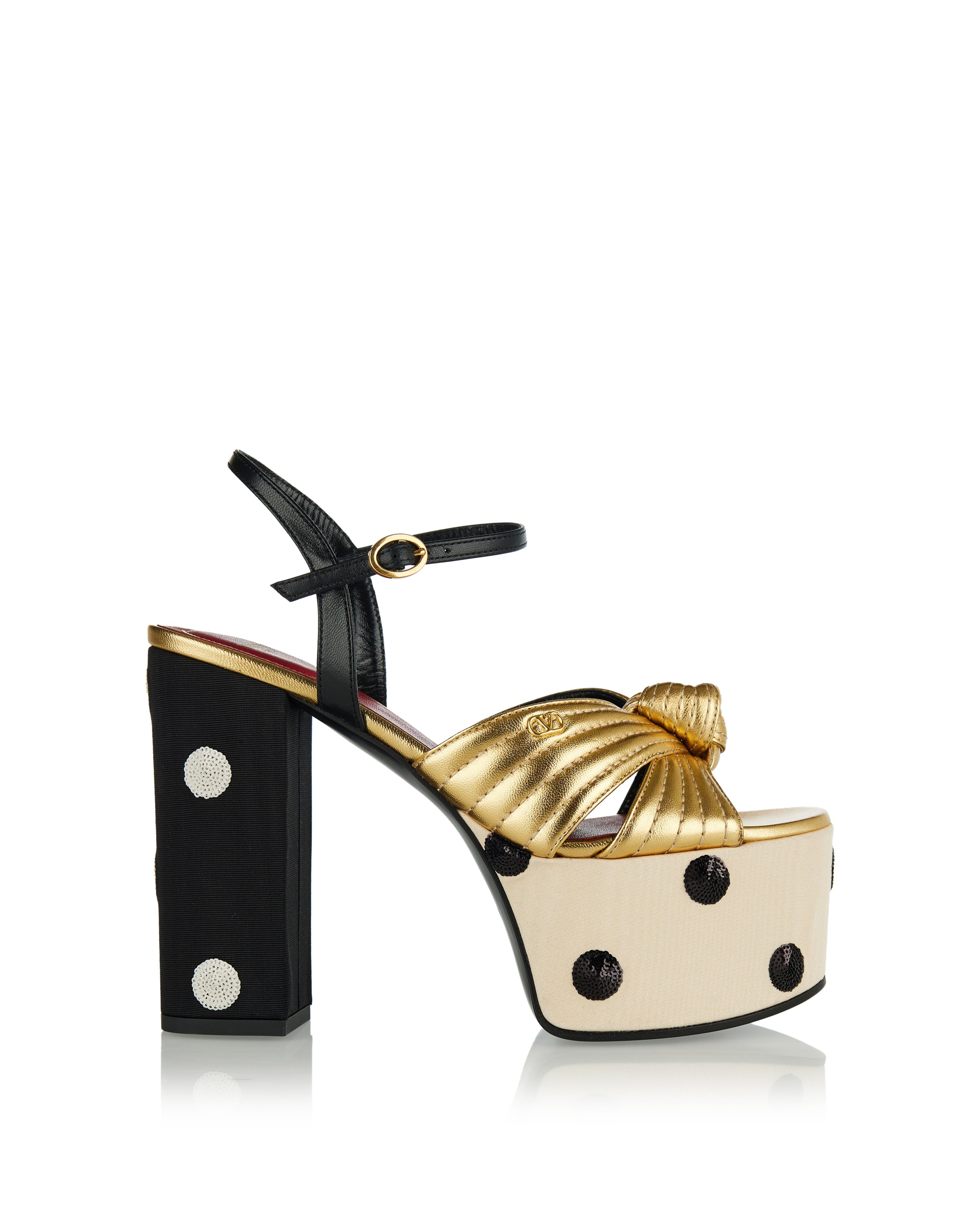 Refined Valentino Garavani crasher platform sandals crafted in laminated nappa and moiré fabric with intricate plus de pois sequin embroidery, an adjustable capretto leather strap, and signature VLogo brass‑finish hardware. With a high block heel and platform, they elevate evening and special‑occasion wardrobes with couture‑inspired Italian luxury.