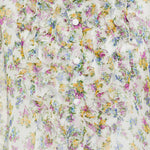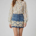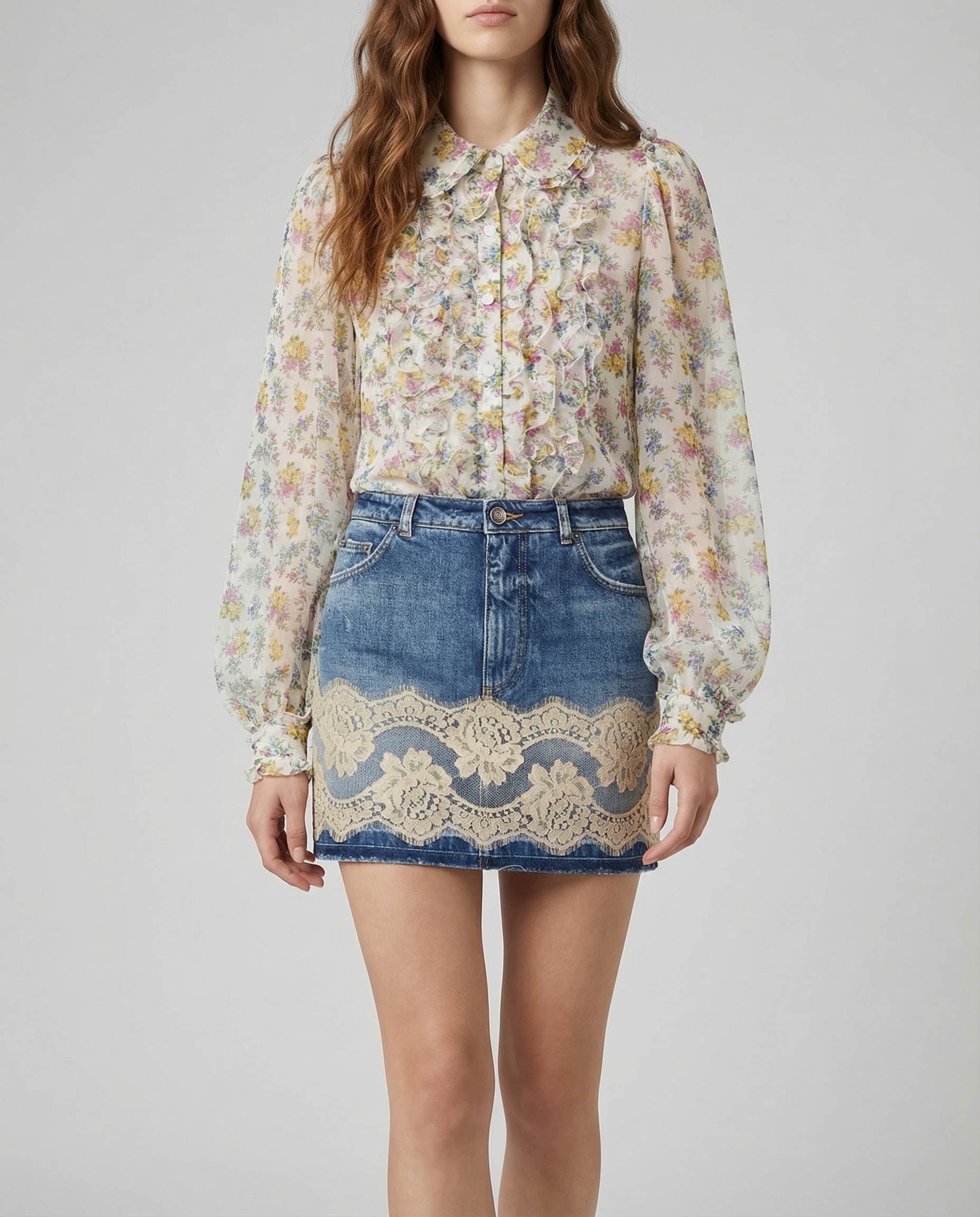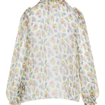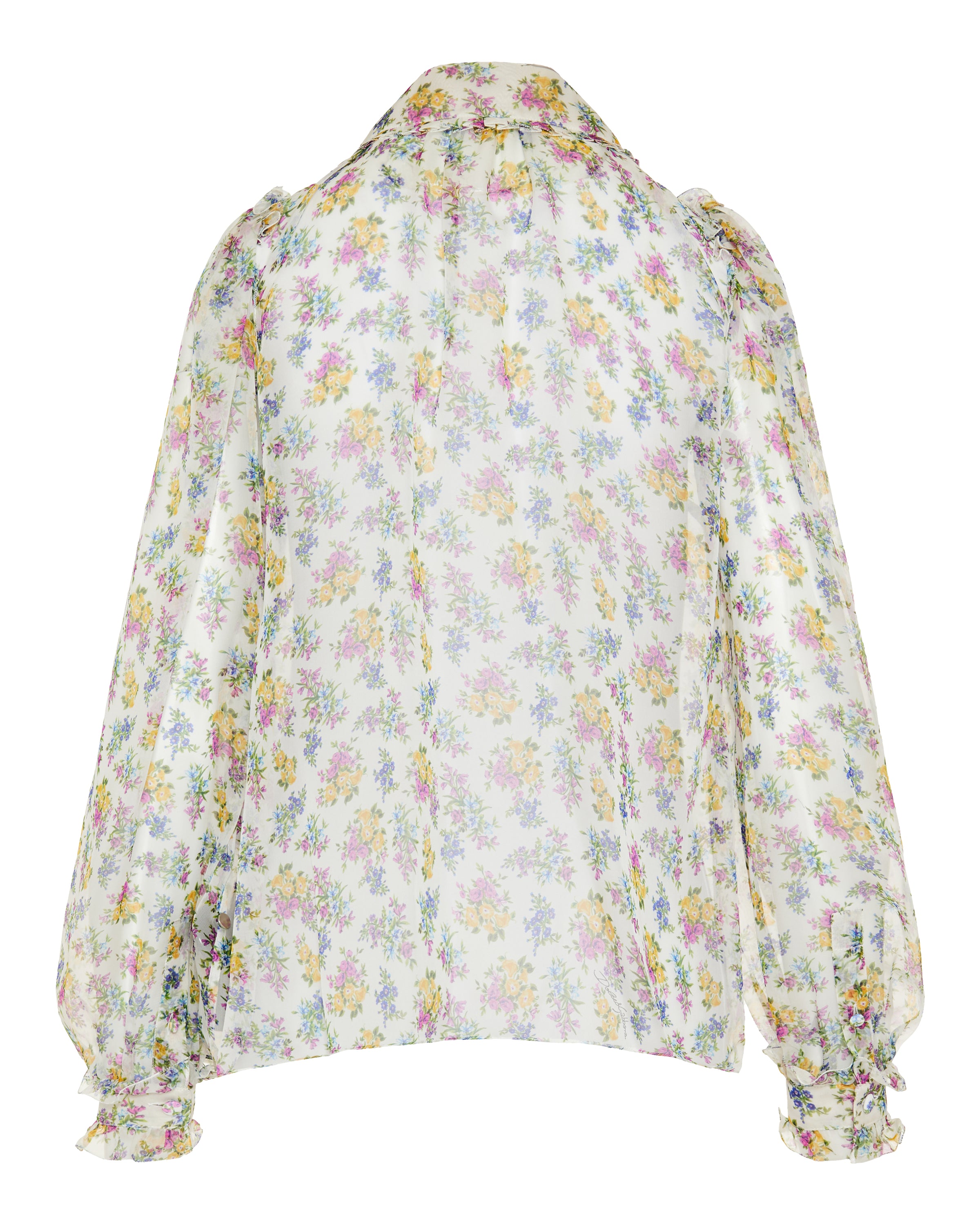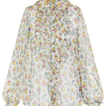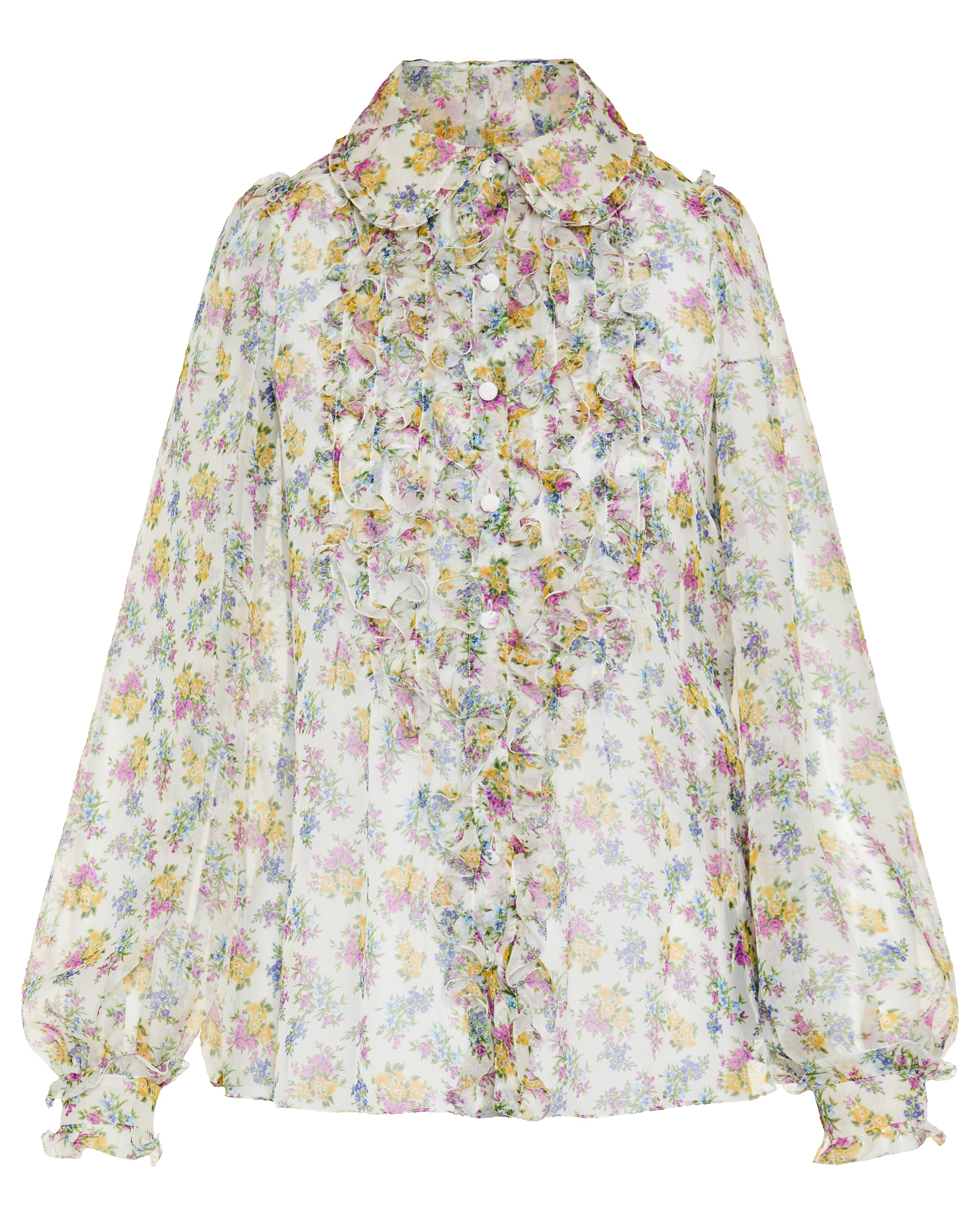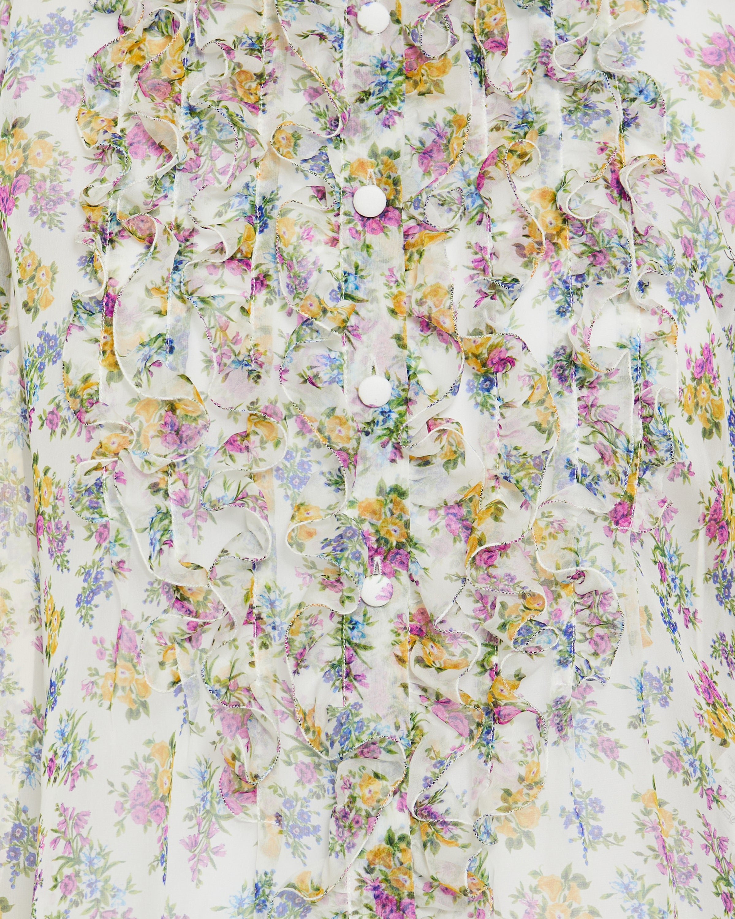 A lightweight blouse in woven fabric, defined by delicate ruffles and a feminine floral motif.